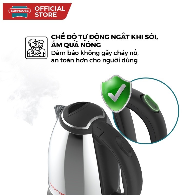 Ấm siêu tốc là sản phẩm tiện lợi không thể thiếu tại các gia đình hiện nay. Chỉ trong vài phút, bạn đã có được nước nóng để sử dụng trong sinh hoạt hàng ngày như pha trà, cafe, hãm mì,... Đặc biệt, với những gia đình có trẻ nhỏ, sản phẩm càng trở nên hữu ích những khi bạn cần pha sữa, nấu cháo. Đặc biệt, bạn có thể đun một chút nước đủ dùng thay vì phải đun nhiều nước như kiểu ấm điện truyền thống. Đây cũng chính là một trong những ưu điểm vượt trội của ấm siêu tốc SUNHOUSE nói chung và sản phẩm ấm siêu tốc HAPPY TIME HTD1055 nói riêng. MẪU MÃ ĐƠN GIẢN, TINH TẾ, TIỆN DỤNGThân ấm bằng inox sáng bóng, không gỉThân ấm siêu tốc làm bằng thép không gỉ sáng bóng, không xỉn màu và đặc biệt là không để lại cặn dưới đáy ấm sau thời gian dài sử dụng.Miệng ấm lớnSản phẩm được thiết kế với miệng ấm lớn giúp bạn dễ dàng lau chùi bên trong và châm nước mỗi khi cần sử dụng.Tay cầm bằng nhựa chịu nhiệt siêu bềnẤm được thiết kế với dáng đứng thon gọn, với tay cầm bằng nhựa cao cấp chịu nhiệt tốt, rất tiện cầm nắm và di chuyển dễ dàng.Thân ấm xoay 360 độ linh hoạt trên đế tiếp điệnĐế tiếp điện được thiết kế độc lập, tách rời khỏi thân ấm, giúp việc đổ nước – tiếp nước dễ dàng, linh hoạt. Ấm có thể xoay 360 độ trên đế tiếp điện, người dùng có thể đặt ấm lên hay nhấc ấm ra khỏi đế ở bất cứ góc nào mà không phải lo lắng đến vấn đề phải đặt sao cho khớp.ĐUN SÔI NHANH – AN TOÀN TUYỆT ĐỐITiết kiệm điện năngCông suất mạnh 1500W cho thời gian nấu nước nhanh chóng, giúp tiết kiệm thời gian và điện năng tối đa.Chế độ tự động tắt khi nước sôi hoặc cạn nướcẤm có chế độ ngắt tự động khi nước sôi hoặc cạn nước, đảm bảo an toàn tối đa cho người sử dụng (quên/bận rộn công việc khác). Chức năng này còn giúp làm tăng tuổi thọ sản phẩm và phòng chống cháy nổ.Đèn LED tự động báo hiệu bật/tắtĐèn sáng đỏ từ khi bắt đầu cho đến khi kết thúc quá trình đun sôi nước, giúp người sử dụng dễ dàng nhận biết nước đã sôi hay chưa mà không cần mở nắp.