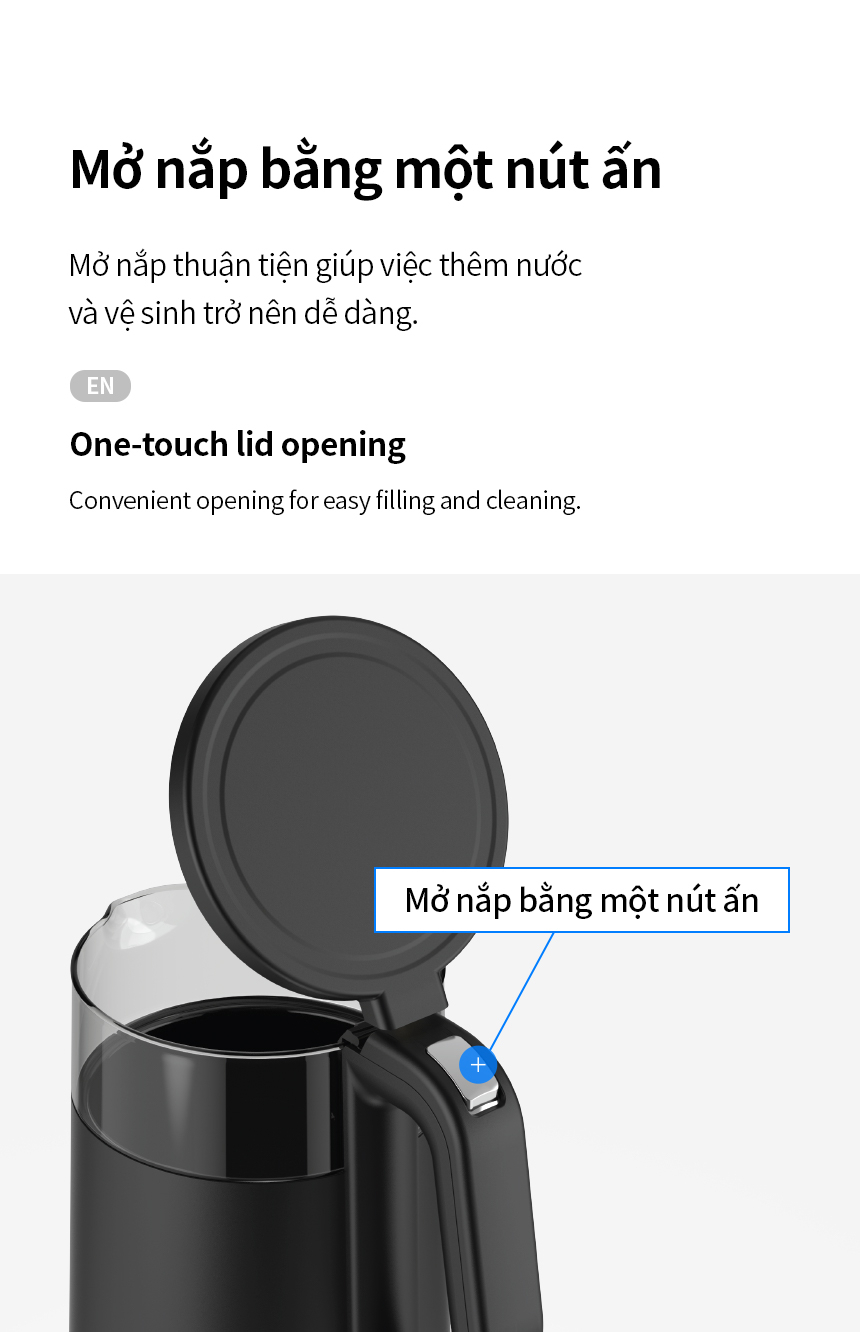 MỞ NẮP BẰNG MỘT NÚT ẤN: Mở nắp thuận tiện giúp việc thêm nước và vệ sinh trở nên dễ dàng