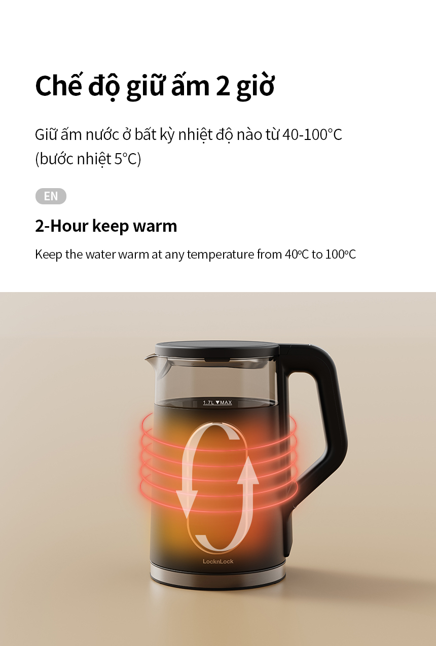CHẾ ĐỘ GIỮ ẤM 2 GIỜ: Giữ ấm nước ở bất kỳ nhiệt độ nào từ 40-100°C (bước nhiệt 5°C)