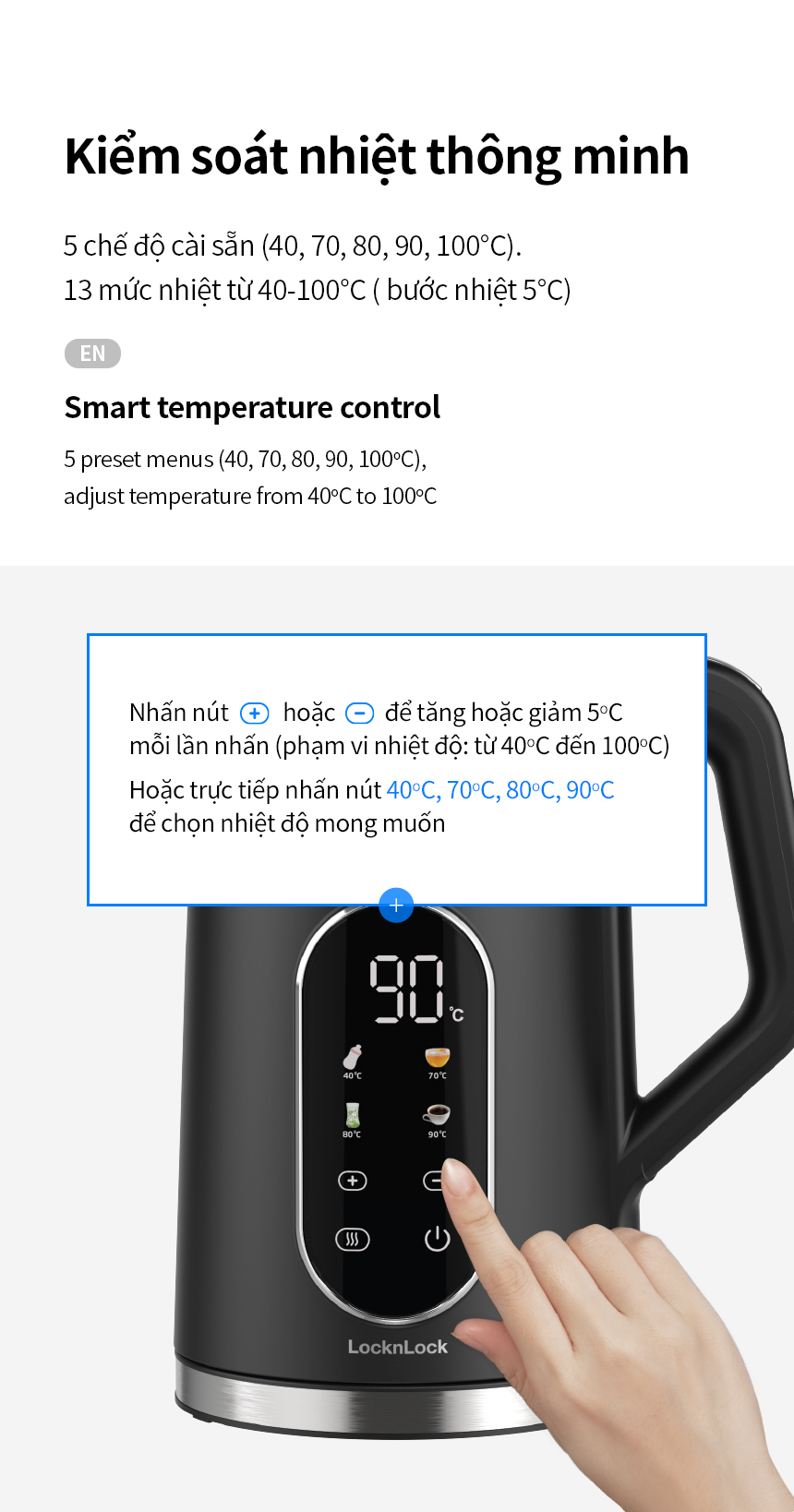 KIỂM SOÁT NHIỆT ĐỘ THÔNG MINH: 5 chế độ cài sẵn (40, 70, 80, 90, 100°C). 13 mức nhiệt từ 40-100°C ( bước nhiệt 5°C)