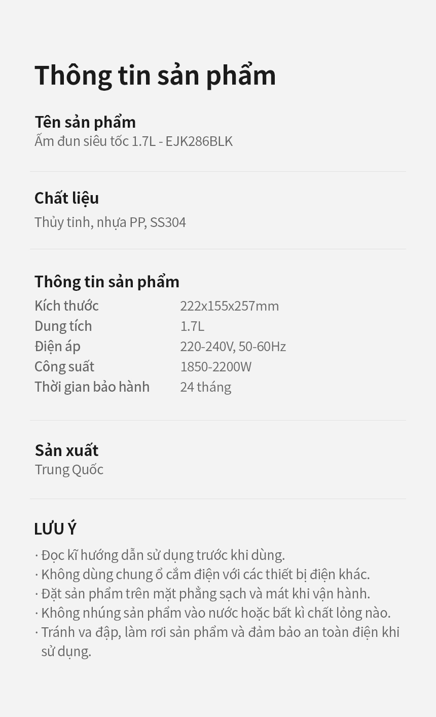 *** Mẹo sử dụng để nâng cao tuổi thọ của bình đun siêu tốc: Do các loại bình đun sôi nước theo cơ chế làm nóng mâm nhiệt, nên sau khi nước sôi Quý Khách rót nước ra luôn chừa lại 1 ít nước ở đáy để mâm nhiệt lúc này vẫn còn nóng không bị khô cháy lại.