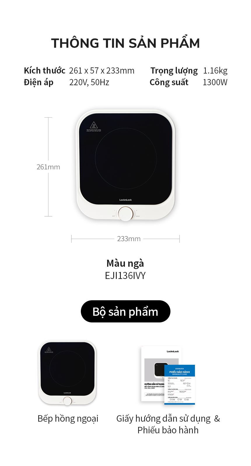 Bếp hồng ngoại mini LocknLock Bianco EJI136IVY, Hàng chính hãng, Dùng được nhiều loại nồi, dễ điều chỉnh - JoyMall