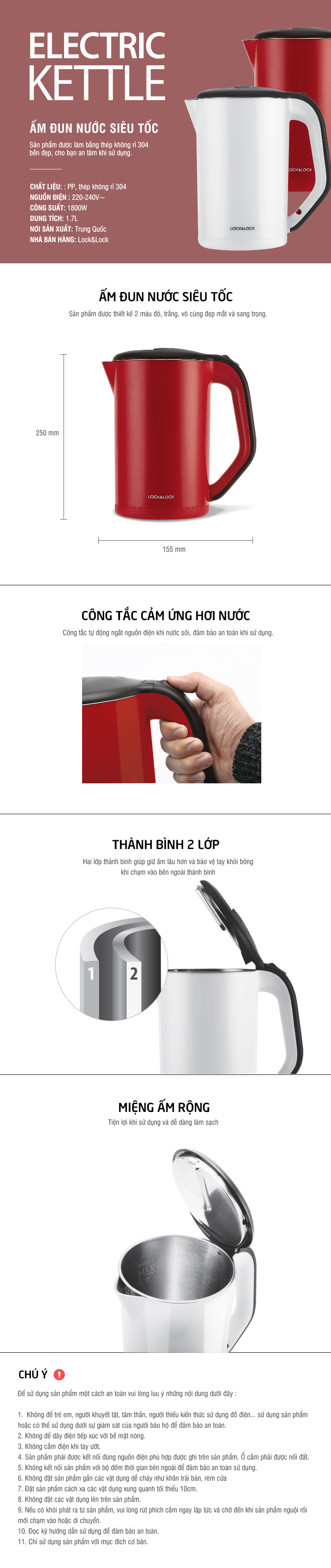 Chất liệu cao cấp Bình đun Lock&Lock EJK738WHT được cấu tạo 2 lớp thành bình chắc chắn giúp giữ ấm lâu hơn và bảo vệ tay khỏi bỏng khi chạm vào với độ bền cao tạo được tuổi thọ lâu dài cho thiết bị. Và mâm nhiệt bằng chất liệu Inox cứng cáp, không gỉ sét, giúp hấp thu nhiệt nhanh, hạn chế rò rỉ điện đảm bảo an toàn khi sử dụng. Tích hợp đế xoay thông minh