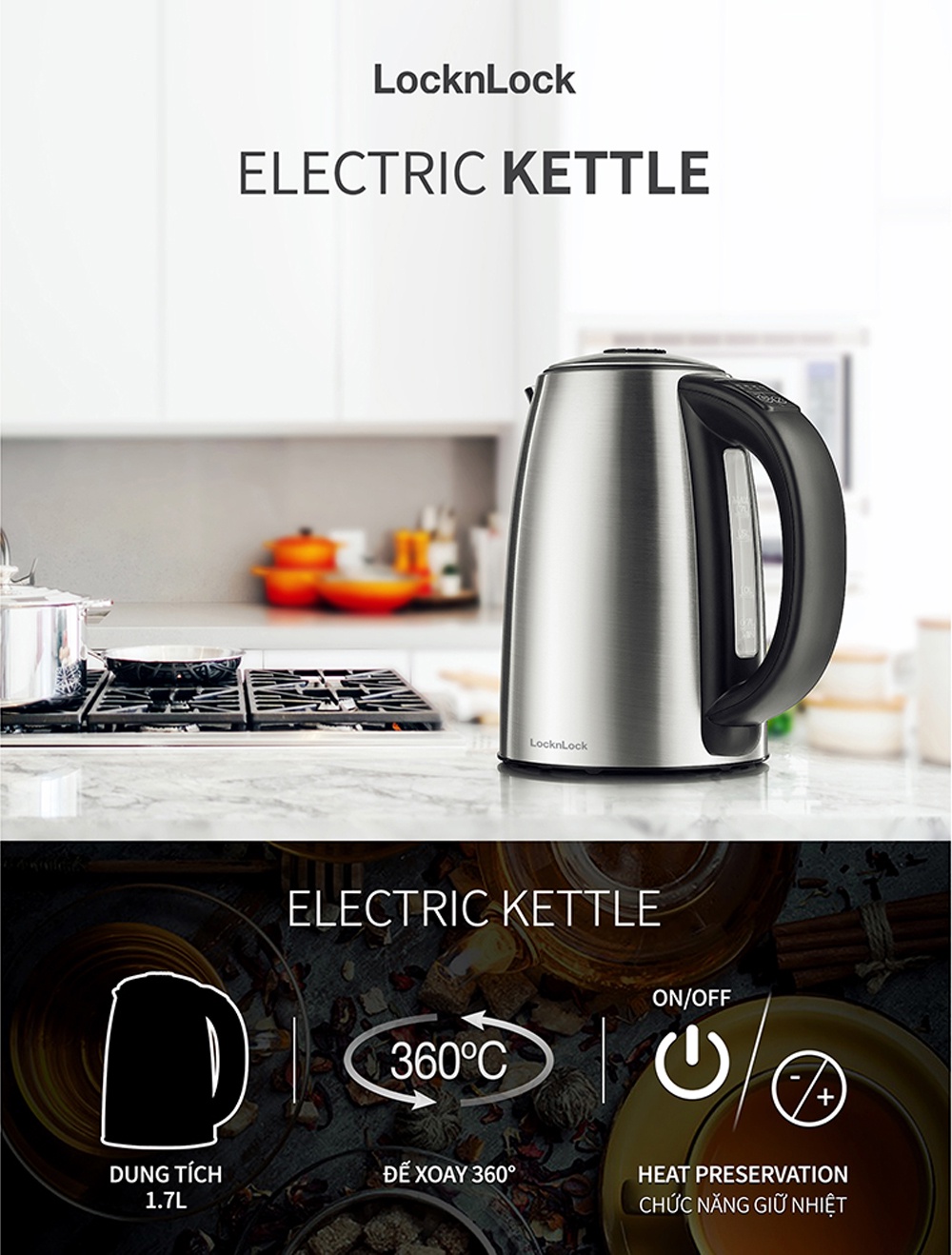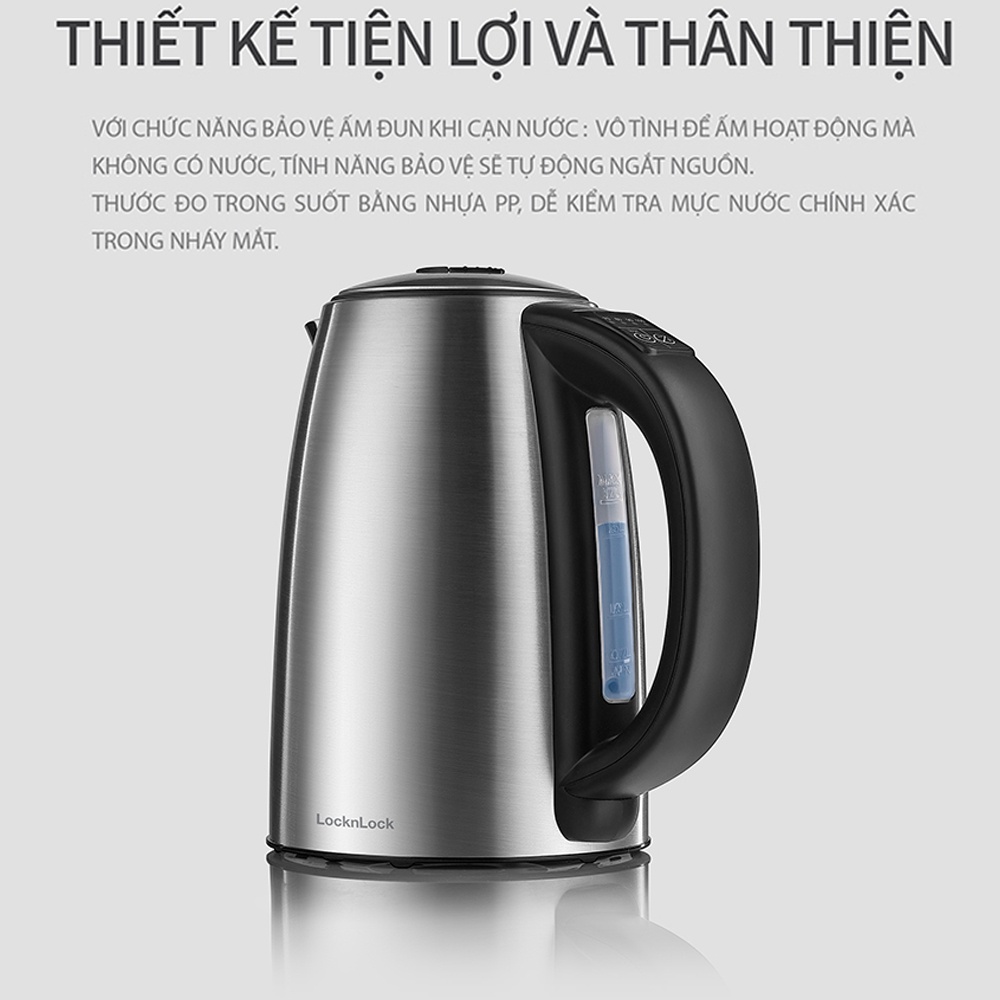 Ấm đun siêu tốc Lock&Lock EJK136SLV 1.7L - Hàng chính hãng, có thể chọn nhiệt độ sôi và giữ nhiệt sau khi đun - JoyMall