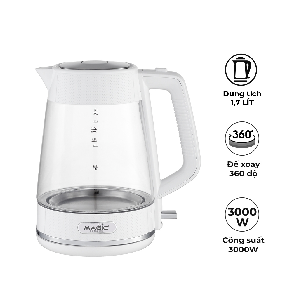 Bình đun siêu tốc thủy tinh MAGIC Eco AC-41 1.7L 3000W, Hàng chính hãng, đế xoay 360 độ - JoyMall