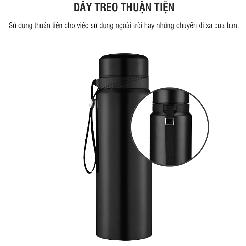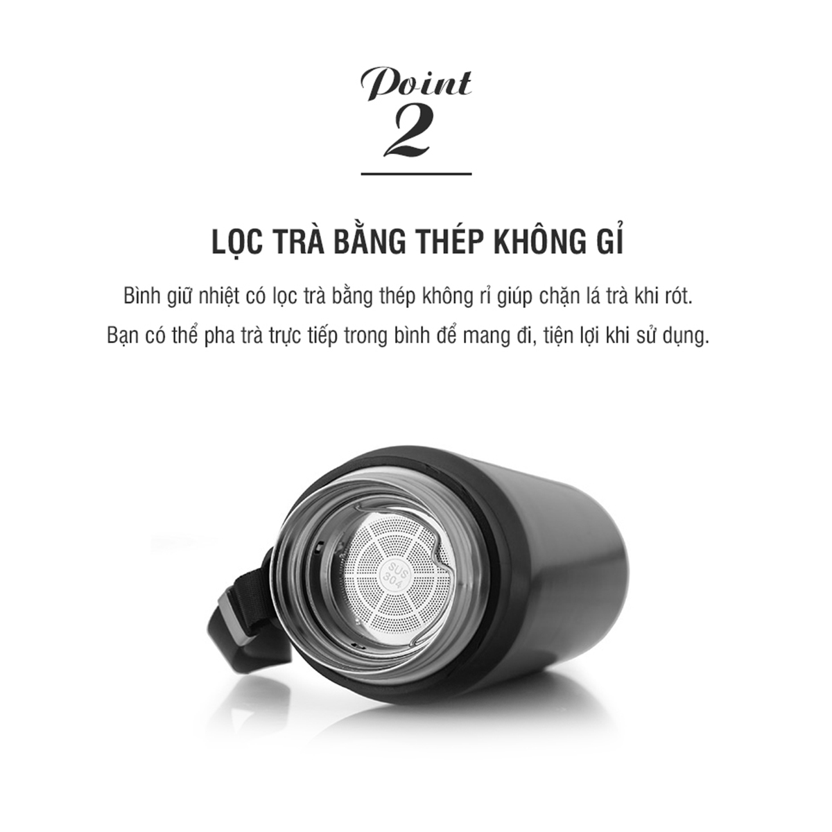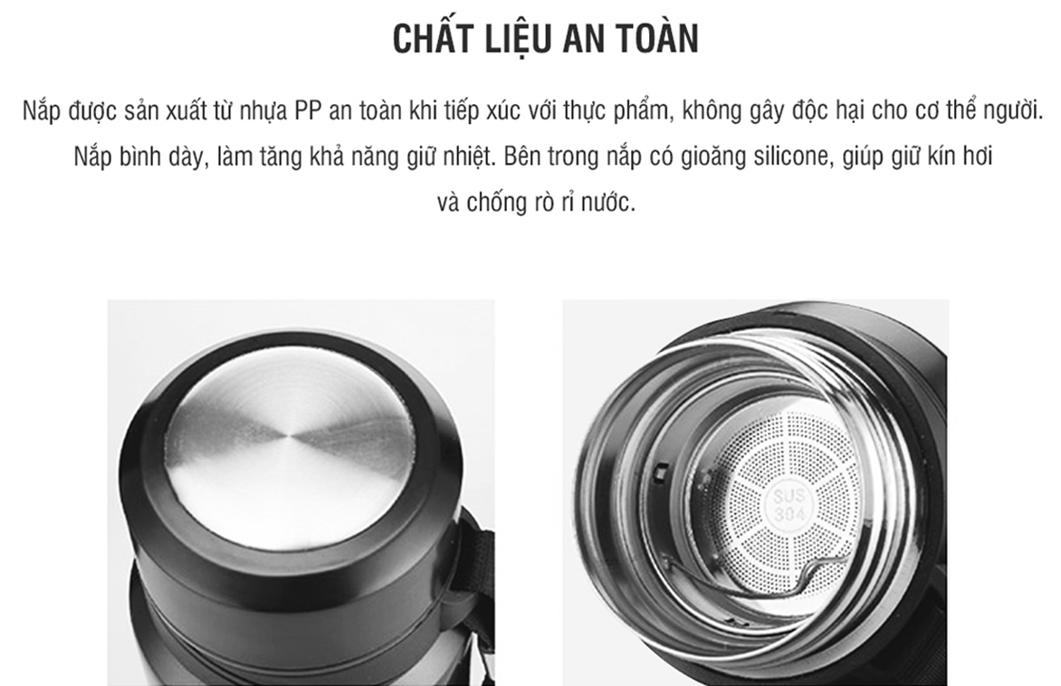 Nắp bình có gioăng vặn kín khít giúp nước không bị tràn ra ngoài khi di chuyển đồng thời tăng khả năng giữ nhiệt bên trong. Phần nắp có gờ giúp bạn dễ dàng khi thao tác vặn mở - đóng, thuận tiện trong quá trình sử dụng.