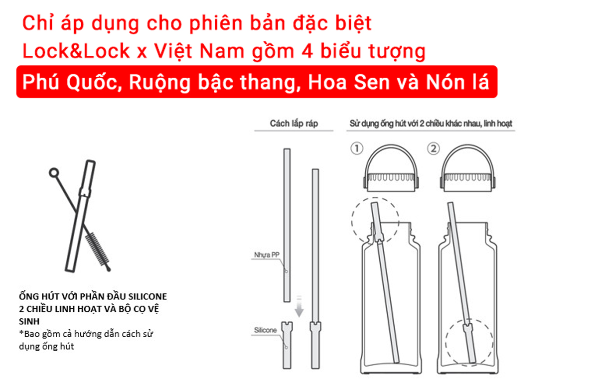 Riêng 4 phiên bản Lock&Lock x Việt Nam đều sẽ được tặng kèm 1 ống hút có đầu Silicone và 1 cọ rửa.
