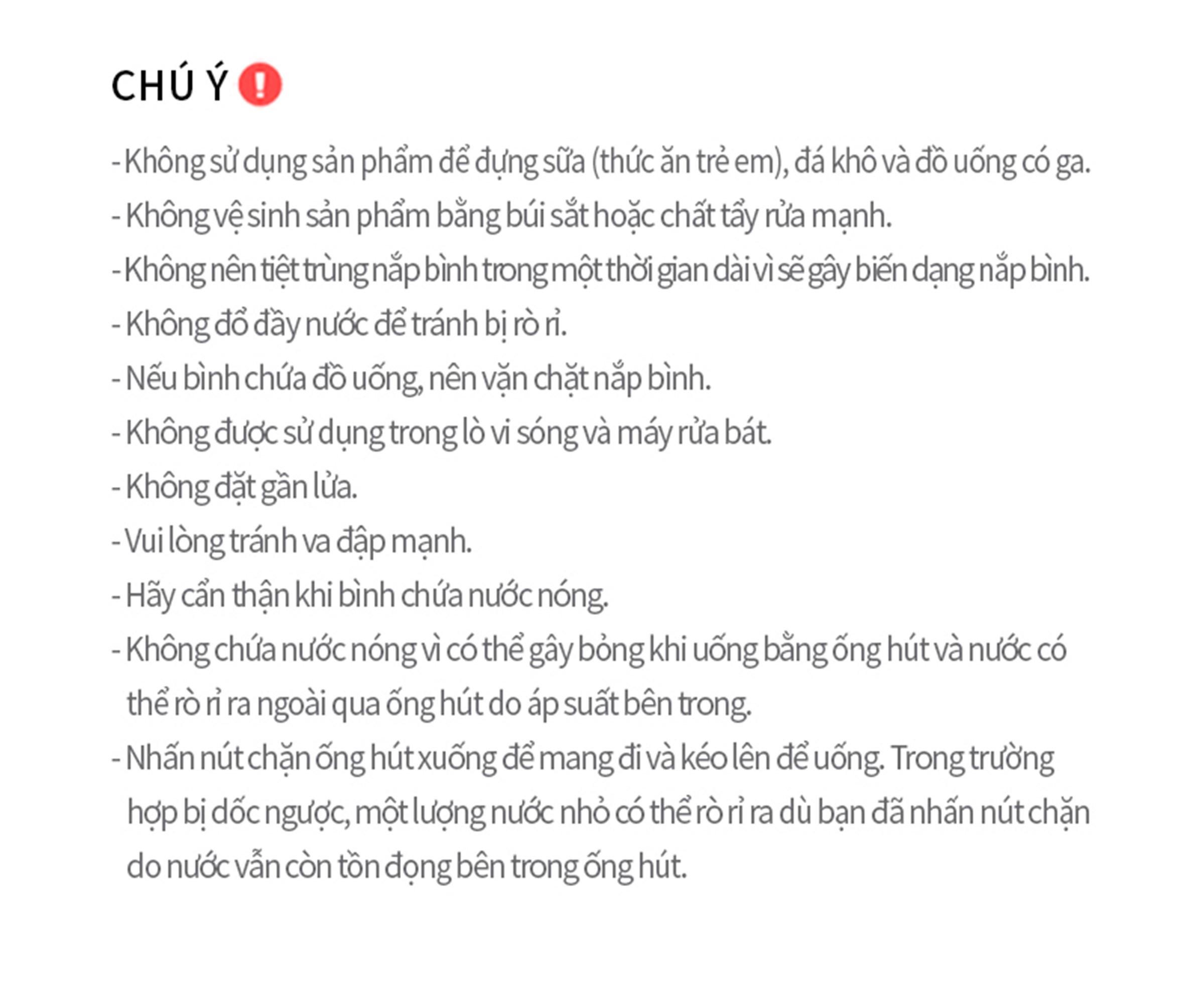 - Không chứa nước nóng vì có thể gây bỏng khi uống bằng ống hút và nước có thể rò rỉ ra ngoài qua ống hút do áp suất bên trong.