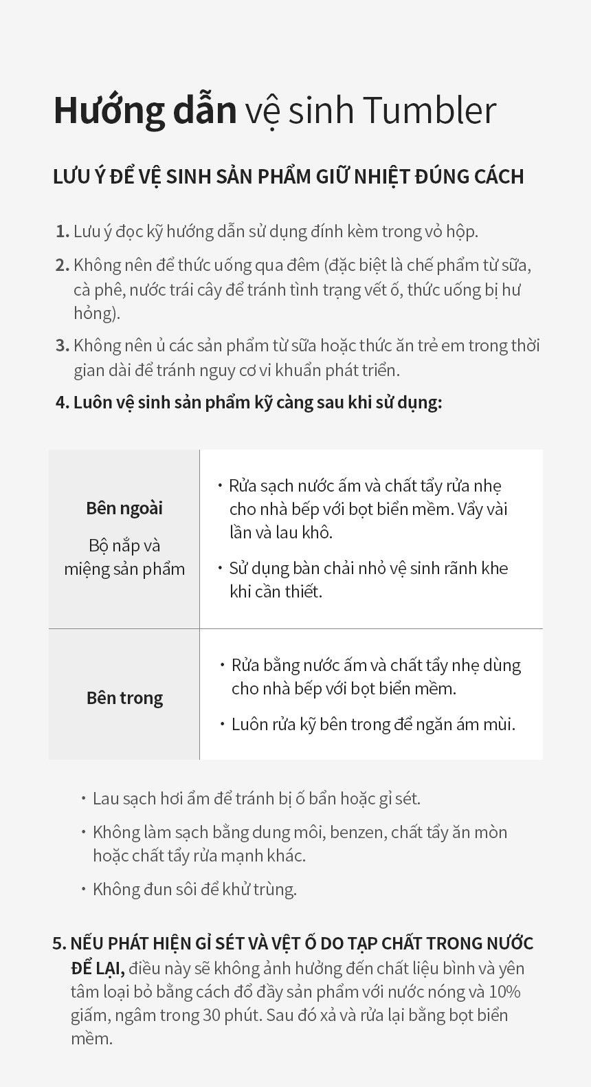 - Không vệ sinh sản phẩm bằng búi sắt hoặc chất tẩy rửa mạnh.