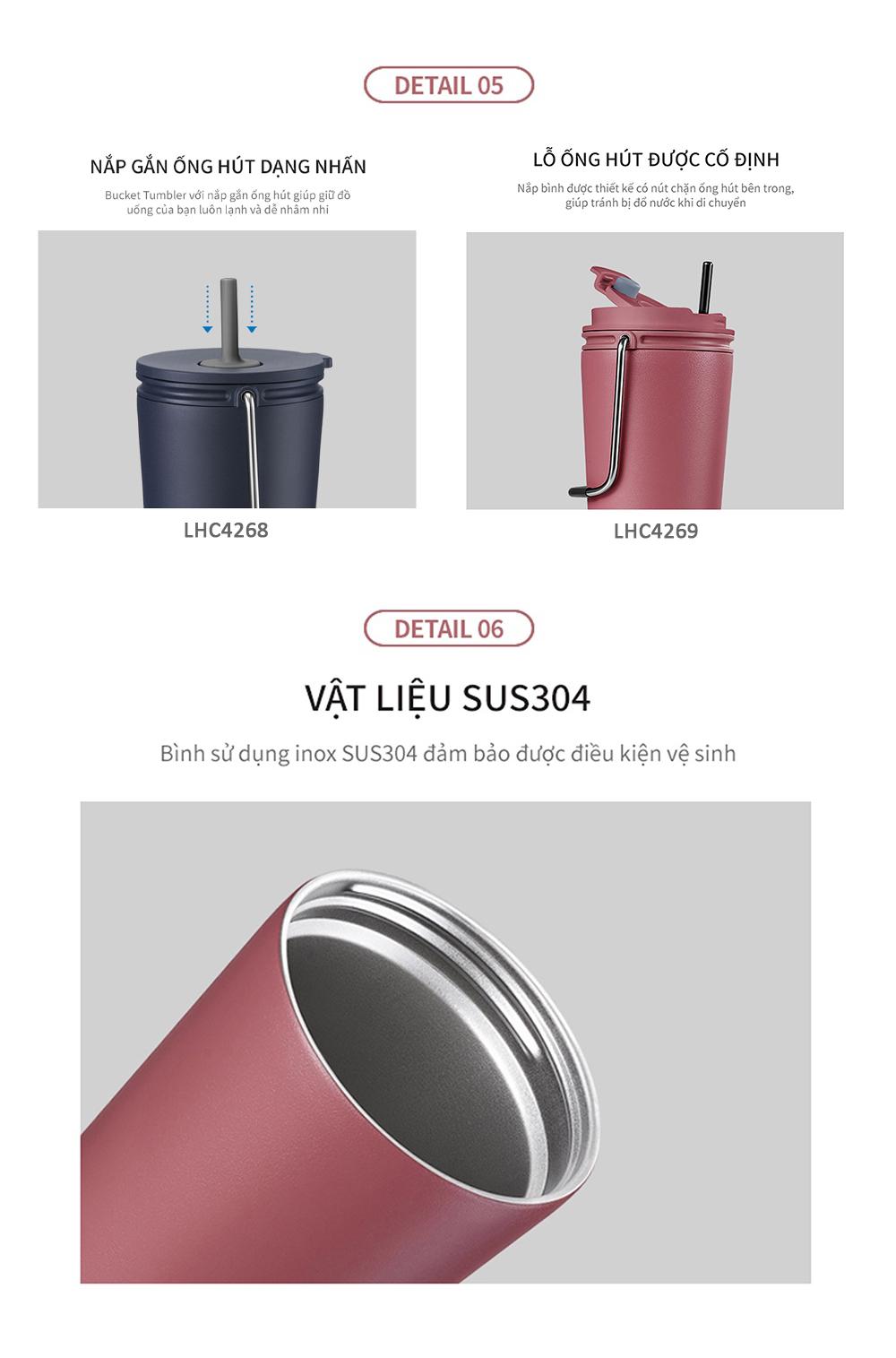 - Chất liệu: Thân: Thép không gỉ (SUS304) / Nắp: PP / Gioăng: Silicone / Tay cầm: Thép không gỉ / Ống hút (LHC4268): PP, Silicone