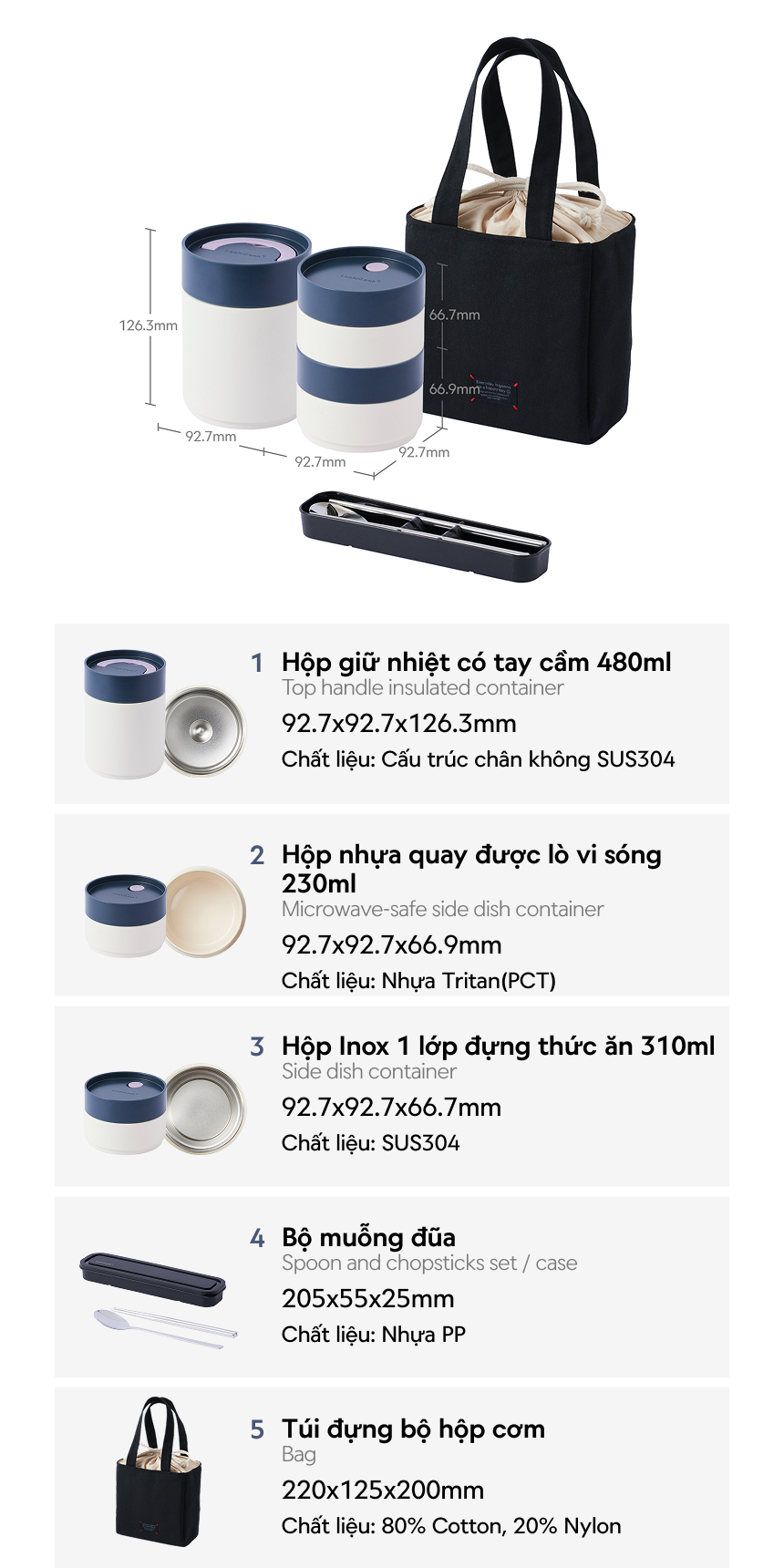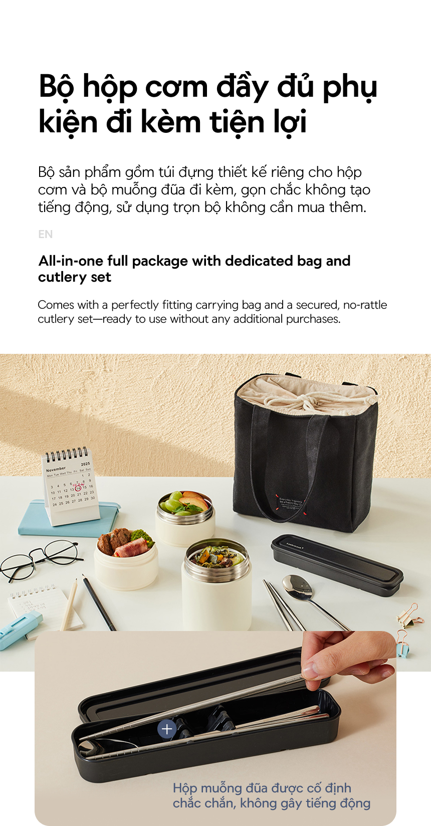 - Bộ sản phẩm tất cả trong một đi kèm túi đựng vừa khít và bộ muỗng đũa được cố định chắc chắn, không gây tiếng động khi di chuyển – sẵn sàng sử dụng ngay, không cần mua thêm phụ kiện.