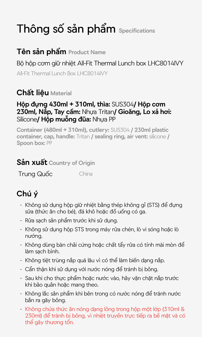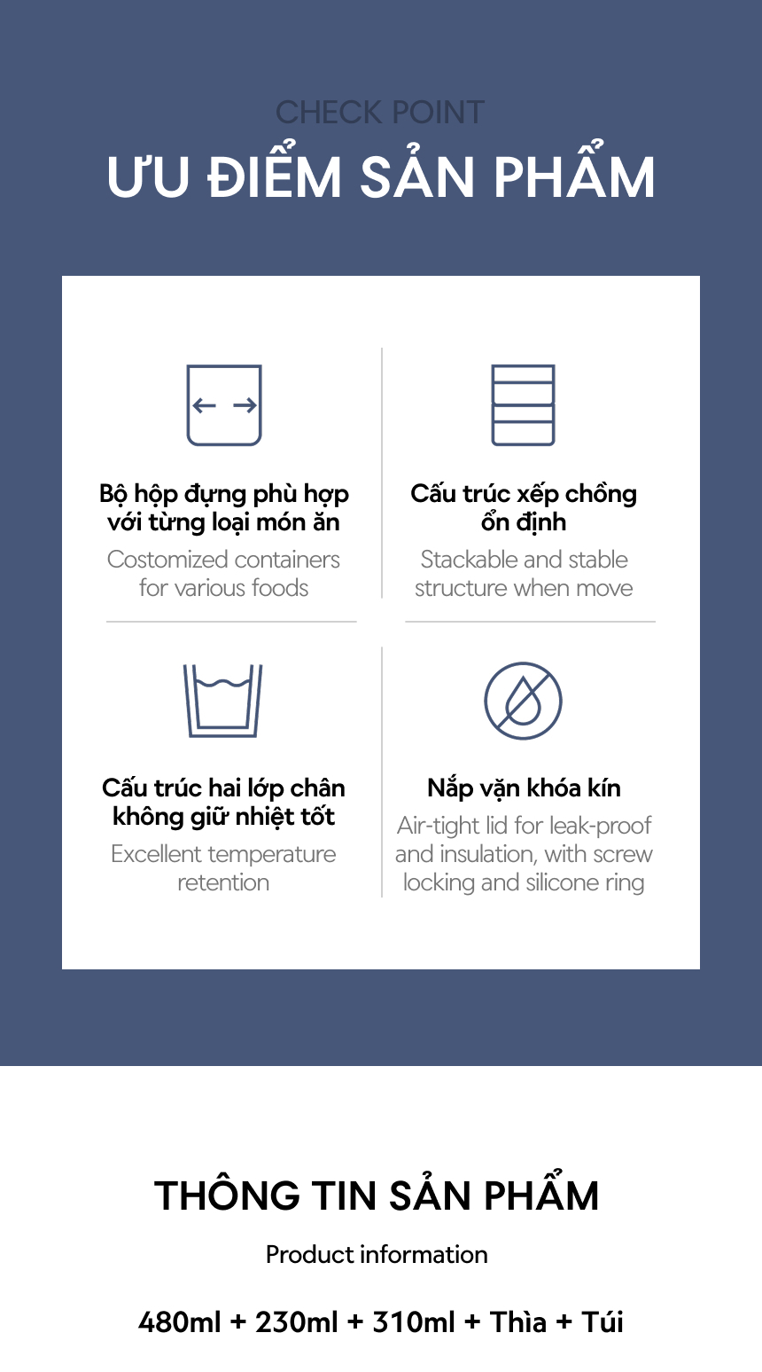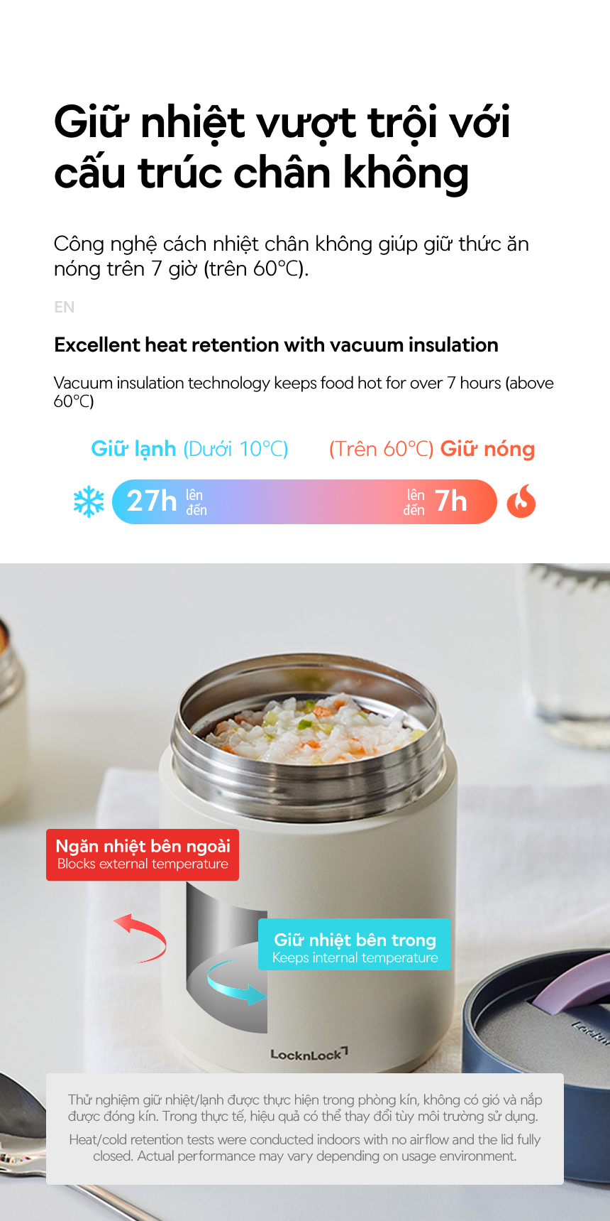 - Công nghệ cách nhiệt chân không giúp giữ thức ăn nóng trên 7 giờ (trên 60℃).