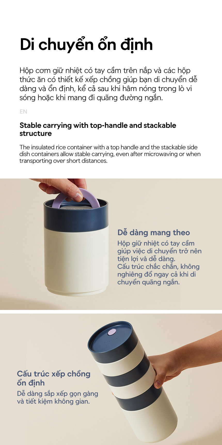 - Hộp giữ nhiệt có tay cầm giúp việc di chuyển trở nên tiện lợi và dễ dàng. Cấu trúc chắc chắn, không nghiêng đổ ngay cả khi di chuyển quãng ngắn.