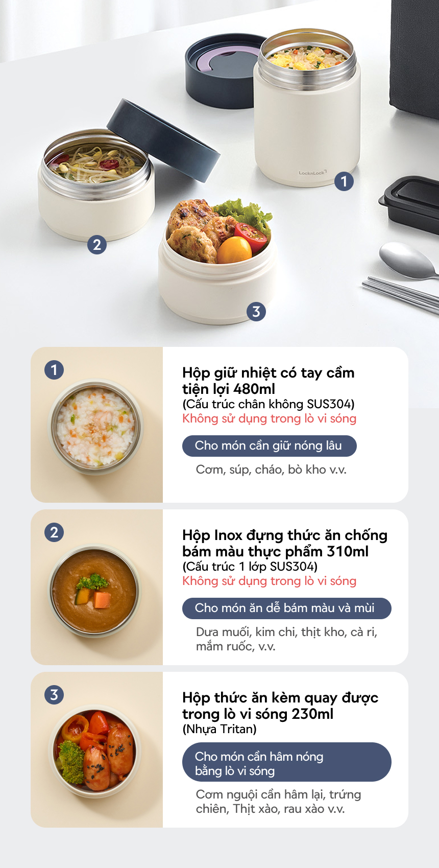 - Thiết kế hộp chuyên biệt cho từng loại món ăn, mang lại sự tiện lợi và linh hoạt trong sử dụng hàng ngày.