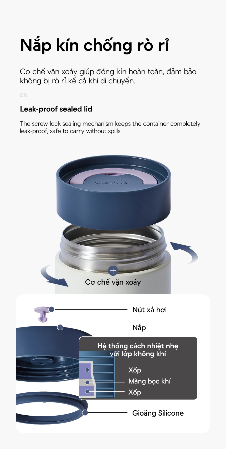 - Nắp vặn khóa kín giúp ngăn tràn tuyệt đối, cho phéρ bạn mang theo an toàn mà không phải lo lắng về việc rò rỉ nước hay thức ăn trong quá trình di chuyển.