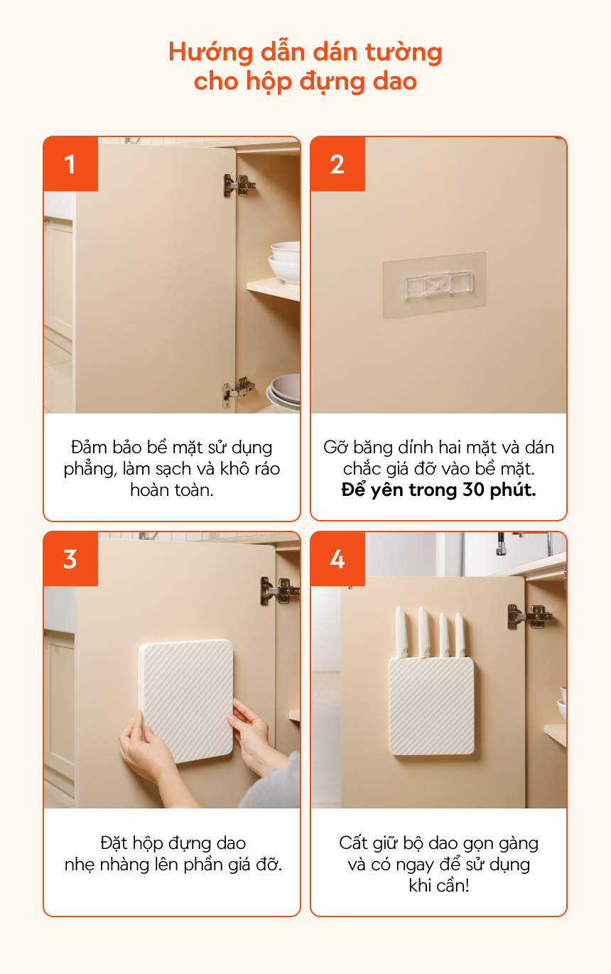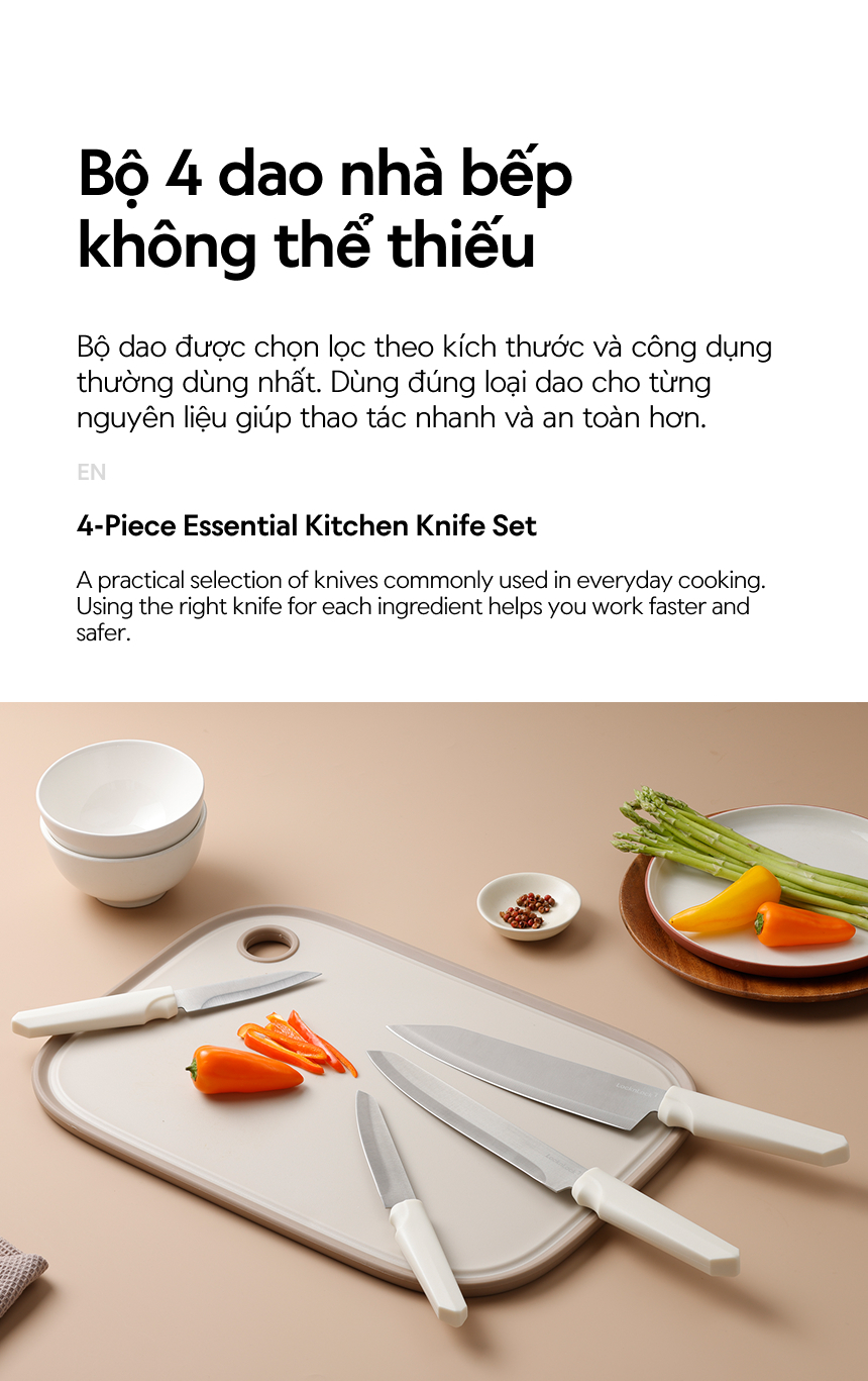 - Bộ sản phẩm bao gồm: 1 Dao đầu bếp, Dao lọc, Dao đa năng, Dao gọt, Hộp đựng dao dán tường
