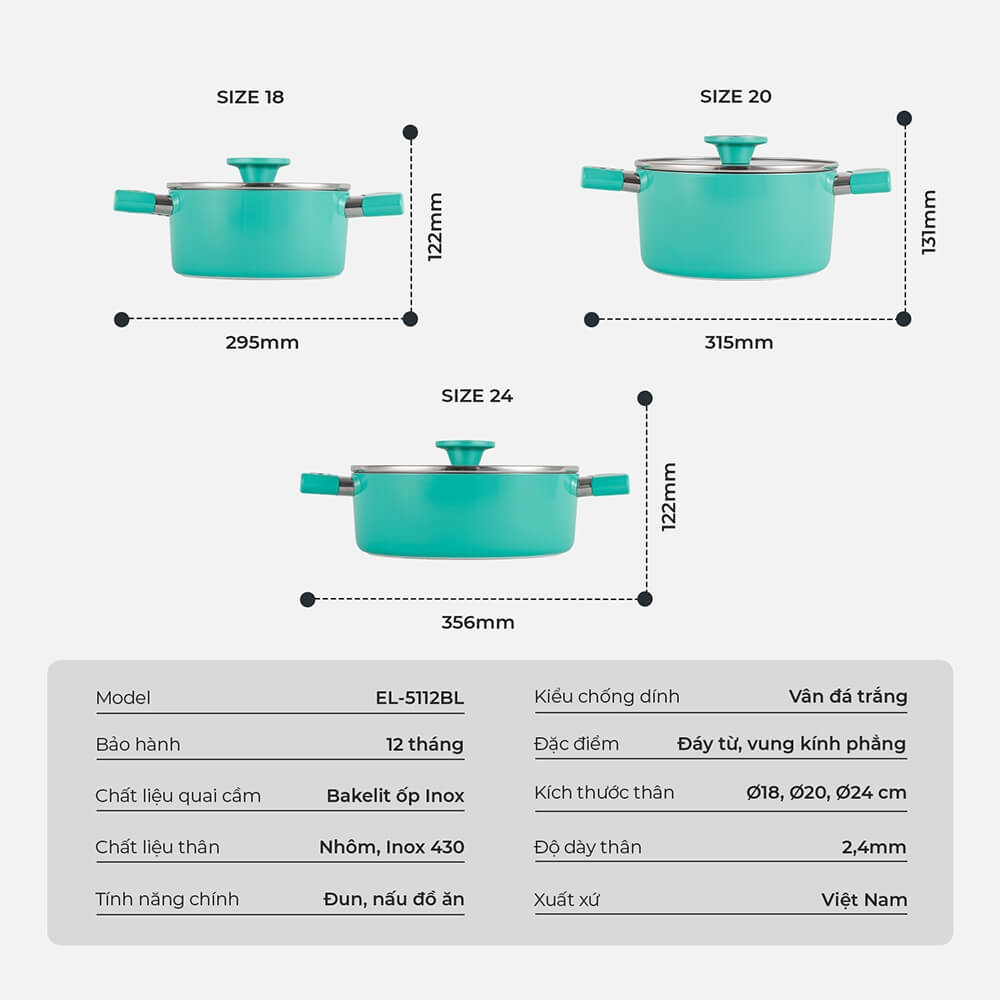 Bộ nồi chống dính vân đá ánh kim siêu bền Elmich EL-5112BL size 18,20,24cm, Hàng chính hãng, Dùng được nhiều bếp - JoyMall