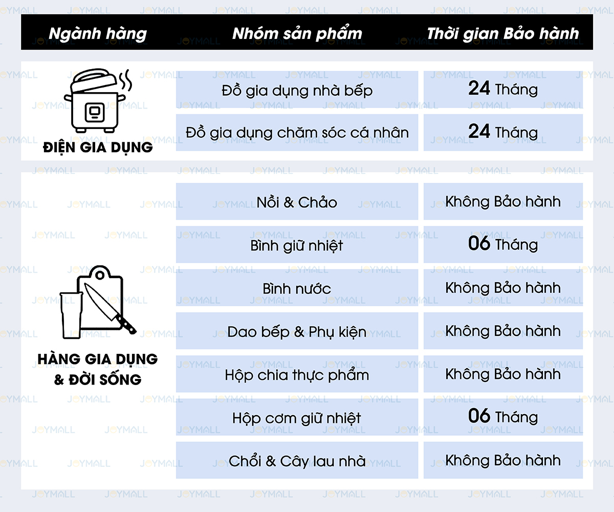 Chính sách bảo hành này chỉ áp dụng đối với các sản phẩm được bán trên một số cửa hàng chính của JoyMall. Nếu khách hàng đã mua hoặc nhận được sản phẩm LocknLock từ người khác không phải là từ JoyMall, vui lòng liên hệ với người bán lẻ hoặc người đã bán hoặc giao sản phẩm cho bạn hoặc trực tiếp đến bộ phận chăm sóc khách hàng của LocknLock để được hỗ trợ.