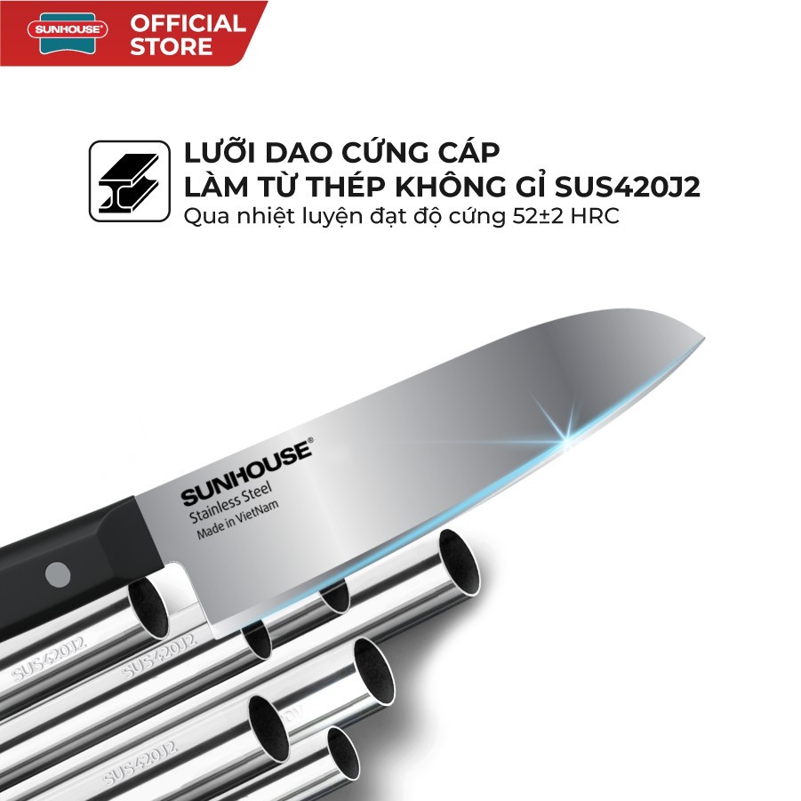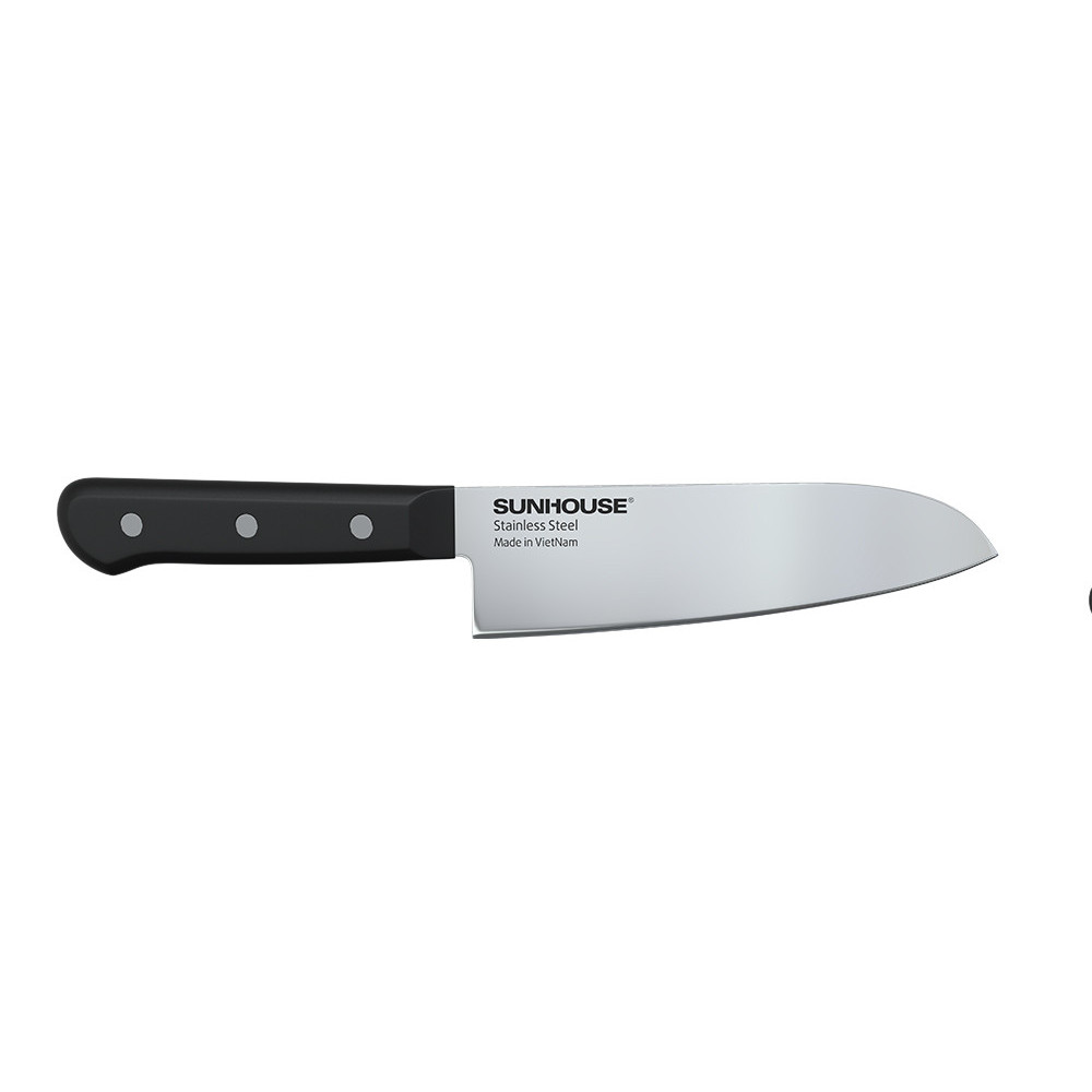 DAO LÀM BẾP ĐA NĂNG SUNHOUSE KS-KN165KS Model: KS-KN165KS ĐẶC ĐIỂM NỔI BẬT • Lưỡi dao sắc bén bởi công nghệ mài đơn đến 65% bề mặt dao, tạo góc cắt nhỏ • Lưỡi dao cứng cáp, không gỉ sét có độ bền cao, đảm bảo an toàn cho sức khỏe • Bề mặt mài lưỡi dao rộng gấp 3 lần giúp mài lại được nhiều lần • Chuôi dao siêu bền và khả năng chịu lực cao bởi công nghệ đúc 2 lớp • Thiết kế sang trọng, tô điểm thêm nét đẹp cho không gian nhà bếp TỔNG QUAN Thật khó để tưởng tượng chúng ta sẽ xoay sở thế nào trong căn bếp khi thiếu đi con dao bếp đa năng – một phụ tá đắc lực cho những công việc nấu nướng hằng ngày. Với thiết kế sang trọng kết hợp nguyên liệu thép SUS420J2 không gỉ cao cấp, sản phẩm dao làm bếp đa năng giúp chế biến thực phẩm đúng cách, chuẩn bị những bữa ăn nhanh chóng và đầy hứng khởi. Được sản xuất tinh tế và hoàn hảo mang đến cho bạn những nhát cắt sắc bén và độ chính xác cao, dao làm bếp đa năng SUNHOUSE KS-KN165KS sẽ hỗ trợ tối đa cho hầu hết các nhu cầu cắt, thái, băm…đến từ gian bếp của mọi gia đình.