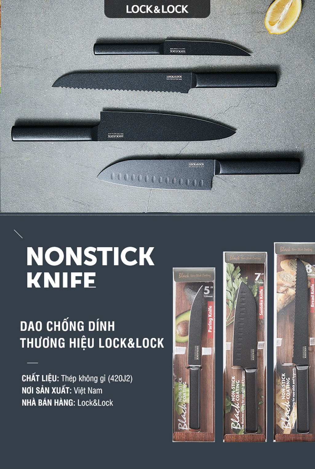 Dao nhà bếp có phủ lớp chống dính hiệu Lock&Lock, phủ chống dính từ lưỡi dao đến chuôi dao, kháng nước, vệ sinh!