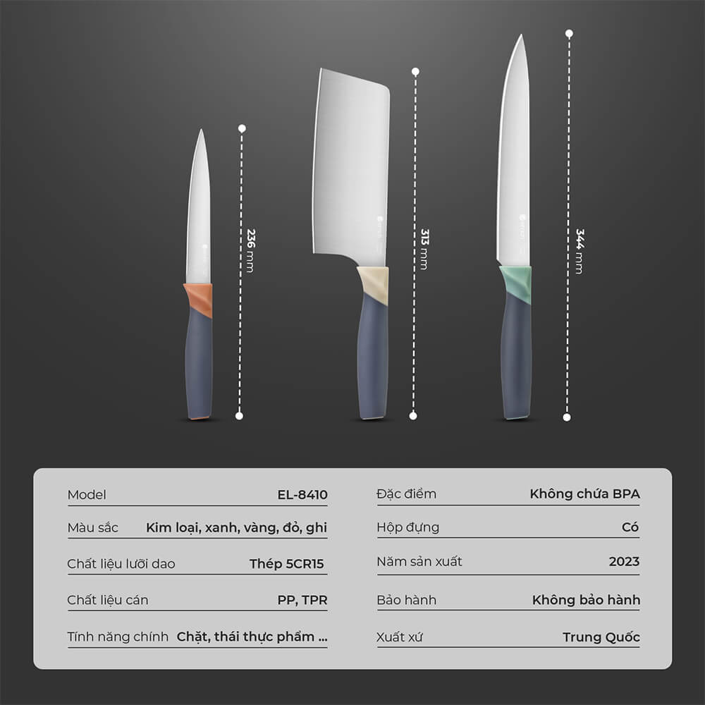Bộ dao gồm 3 món: Dao bản to đa năng, dao thái, dao gọt
