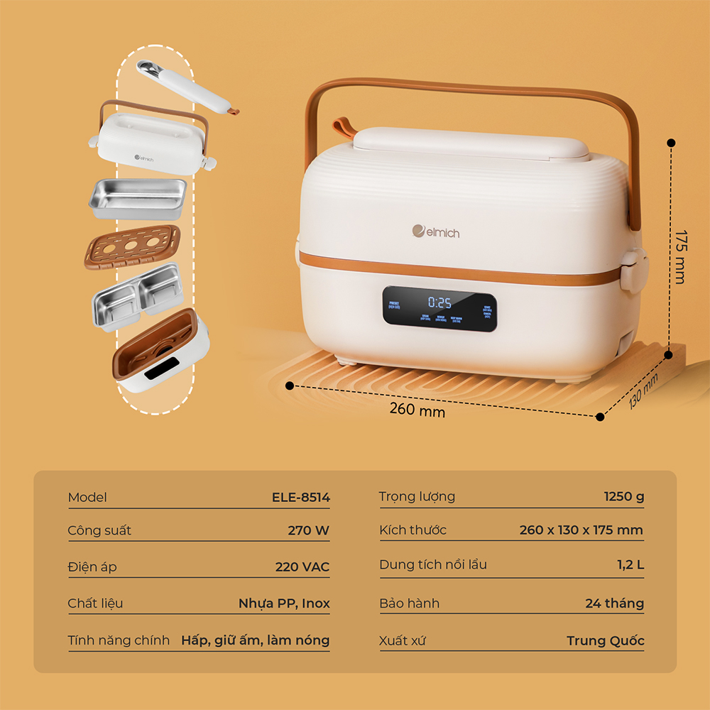 Hộp cơm cắm điện Elmich 1.2L ELE-8514, Hàng chính hãng, 2 tầng 3 ngăn, ngăn riêng đựng muỗng đũa - JoyMall