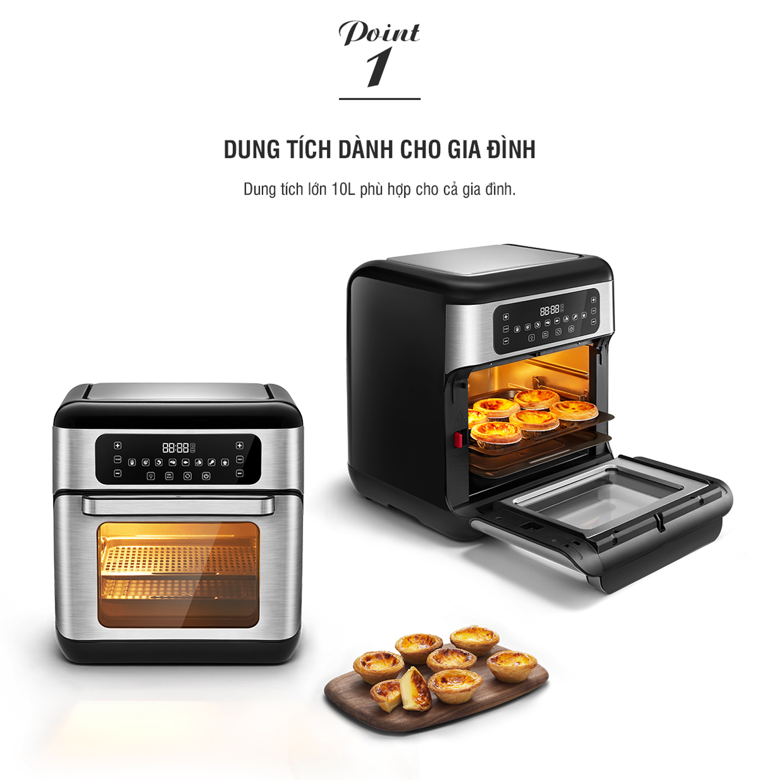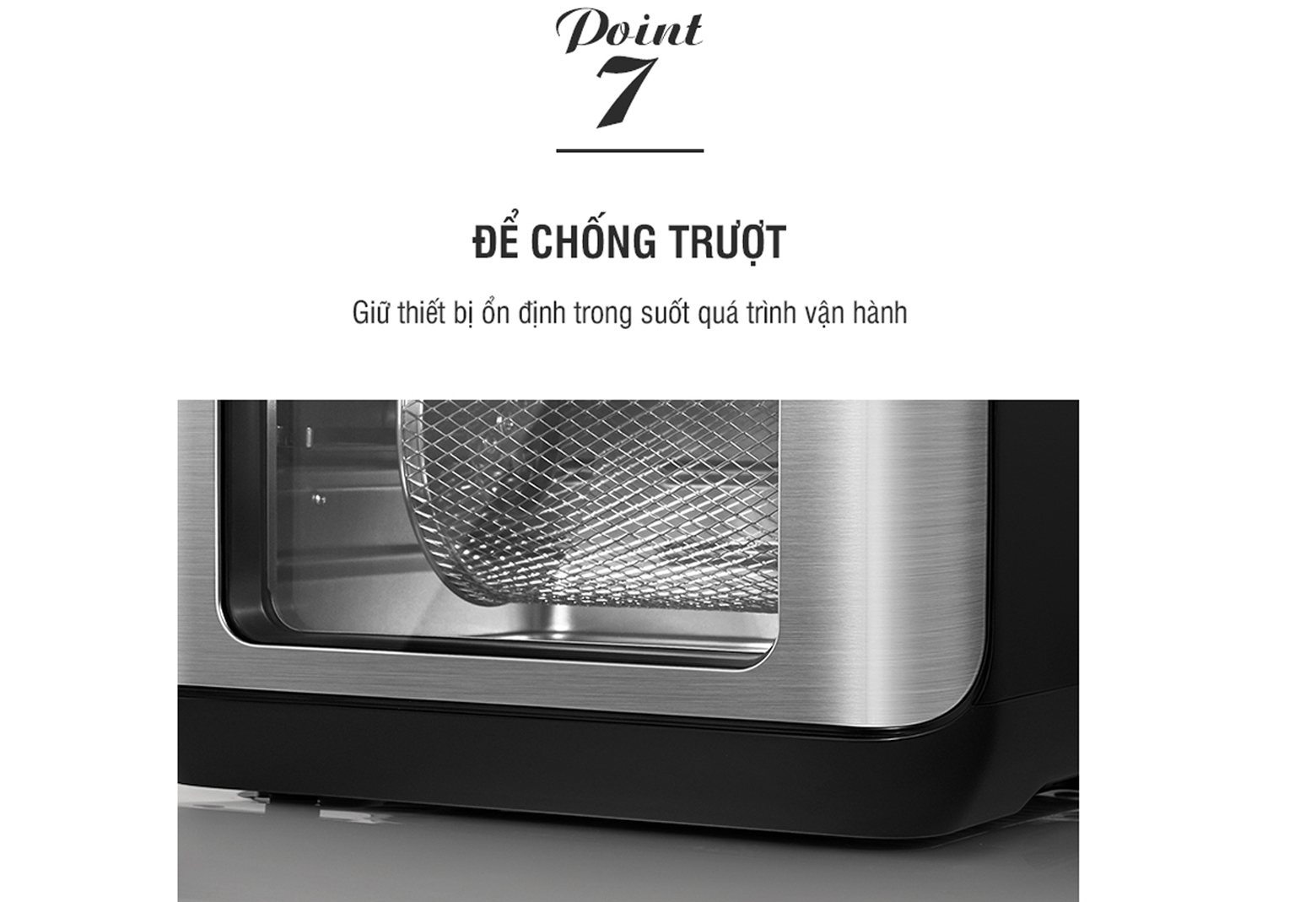 Sản phẩm làm chín thực phẩm bằng các luồng không khí lốc xoáy thay vì dầu nóng, giúp bạn chế biến món ăn lành mạnh hơn. Sản phẩm còn được trang bị bộ lọc mùi và khói. Là sự tổng hợp của nhiều thiết bị và dụng cụ nấu nướng, với bộ hẹn giờ kỹ thuật số được tích hợp chế độ tự động tắt.