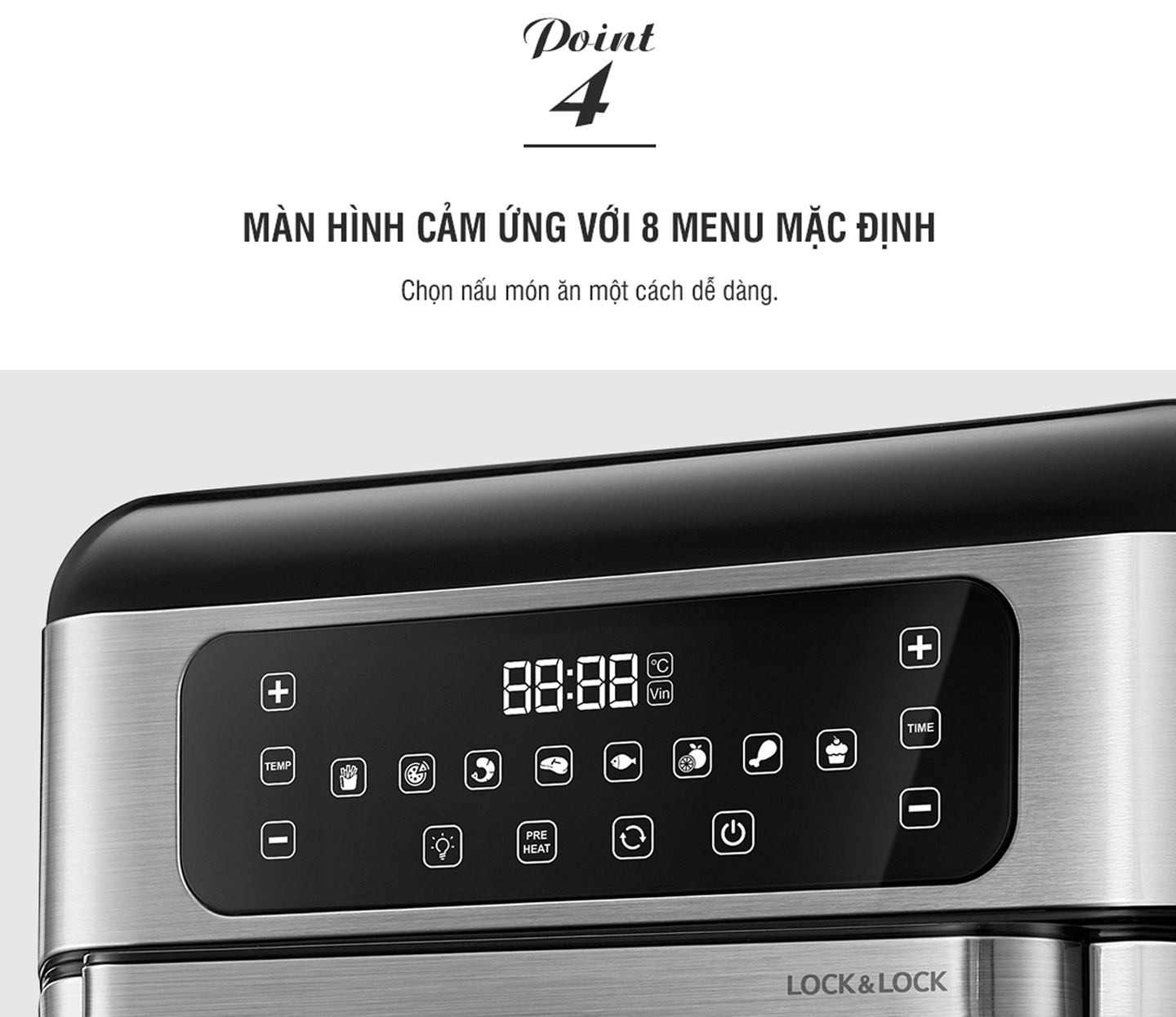 - Màn hình cảm ứng với 8 menu mặc định chọn nấu món ăn một cách dễ dàng