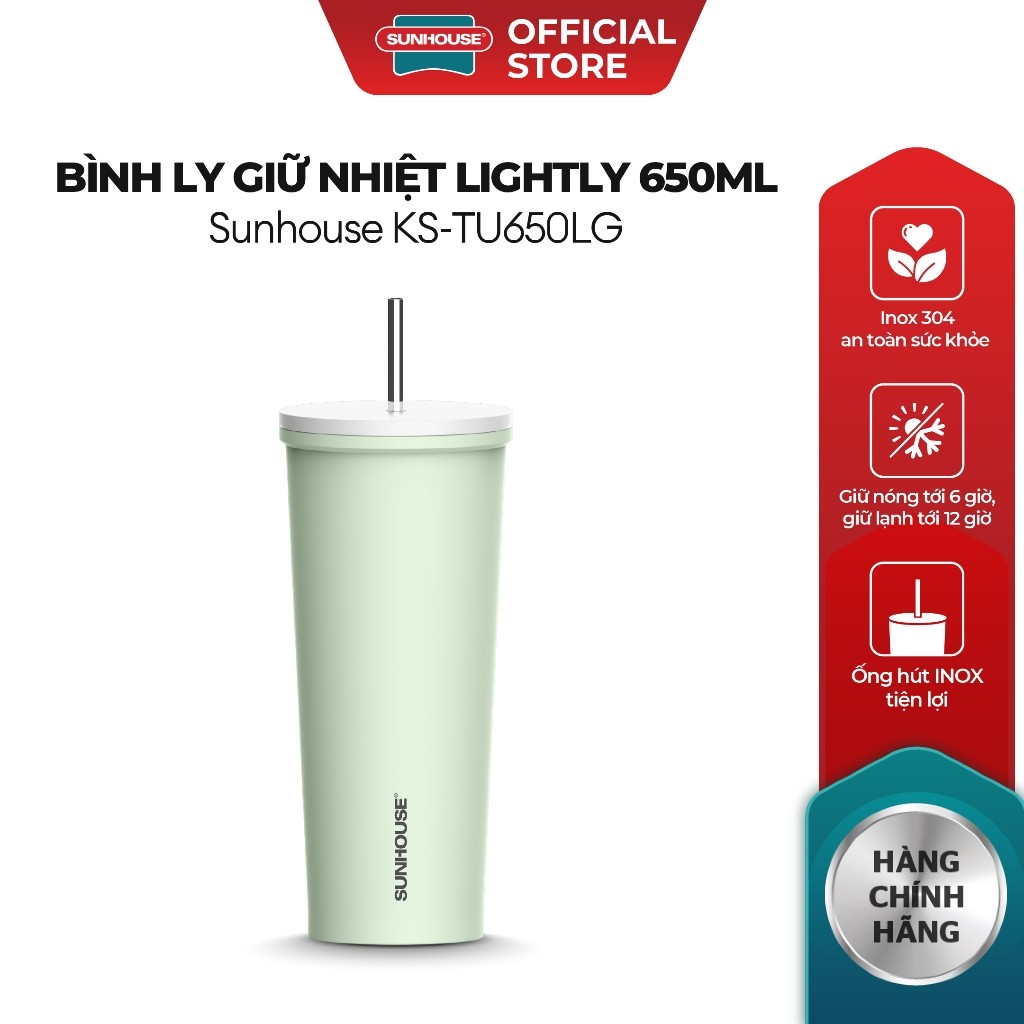Ly Giữ Nhiệt Lightly 650ml Sunhouse KS-TU650LG, Inox 304, Hàng Chính Hãng - JoyMall Hướng đến các sản phẩm chất lượng cao với giá thành hợp lý, phù hợp nhu cầu đa dạng của người tiêu dùng Việt, SUNHOUSE mang đến Bình ly giữ nhiệt Lightly 650ml Sunhouse KS-TU650LG – lựa chọn hoàn hảo cho phong cách năng động, hiện đại, an toàn cho sức khỏe và tiện lợi sử dụng hàng ngày. THIẾT KẾ: TRẺ TRUNG – LINH HOẠT – TIỆN DỤNG 3 phiên bản màu sắc hiện đại – Nổi bật cá tính Bình ly giữ nhiệt Lightly 650ml Sunhouse KS-TU650LG được thiết kế tối giản nhưng tinh tế, với 3 màu sắc trẻ trung để bạn dễ dàng lựa chọn phù hợp sở thích và phong cách riêng. Dù ở nơi làm việc, trường học hay khi dã ngoại, bình luôn là điểm nhấn nổi bật. Miệng bình rộng – Dễ vệ sinh, không lo đóng cặn Thiết kế miệng bình rộng giúp bạn vệ sinh dễ dàng, nhanh chóng loại bỏ cặn bám sau mỗi lần sử dụng, đảm bảo an toàn vệ sinh và hương vị tươi ngon cho thức uống. Lớp phủ bền đẹp – Khó trầy xước Toàn bộ thân bình được phủ lớp sơn đồng nhất cao cấp, chống trầy xước, hạn chế bám bẩn, giữ vẻ ngoài bền đẹp qua thời gian. CÔNG NĂNG GIỮ NHIỆT HIỆU QUẢ – AN TOÀN TUYỆT ĐỐI Thân bình 2 lớp – Ruột inox 304 an toàn sức khỏe Bình ly giữ nhiệt Lightly 650ml Sunhouse KS-TU650LG sở hữu cấu tạo 2 lớp chắc chắn với ruột bình inox 304 cao cấp, đảm bảo an toàn cho sức khỏe người dùng, không thôi nhiễm chất độc hại khi đựng nước nóng hay lạnh. Ống hút inox tiện lợi – Thưởng thức mọi lúc Trang bị ống hút inox thông minh, bạn có thể uống trực tiếp mọi lúc, mọi nơi – từ phòng làm việc, xe hơi đến các buổi picnic, thể thao ngoài trời. Giữ nóng tới 6 giờ – Giữ lạnh tới 12 giờ* Nhờ lớp cách nhiệt dày dặn, Lightly 650ml Sunhouse KS-TU650LG giúp giữ nóng tới 6 giờ và giữ lạnh tới 12 giờ, cho bạn thoải mái thưởng thức đồ uống trọn vị suốt ngày dài. *Kết quả thử nghiệm từ SUNHOUSE. HƯỚNG DẪN SỬ DỤNG • Sử dụng để đựng nước nóng/lạnh hoặc các loại đồ uống yêu thích. • Đảm bảo đậy kín nắp trước khi di chuyển để tránh rò rỉ. LƯU Ý KHI SỬ DỤNG • Không đổ quá đầy khi rót nước nóng hoặc đồ uống có gas. • Không sử dụng để đựng sữa hoặc thức ăn cho trẻ nhỏ. • Tránh va đập mạnh, không sử dụng trong lò vi sóng hoặc máy rửa bát. • Vệ sinh bằng nước ấm và chất tẩy rửa trung tính, không dùng búi sắt hoặc chất tẩy mạnh. • Trẻ em cần sử dụng dưới sự giám sát của người lớn để tránh bỏng.