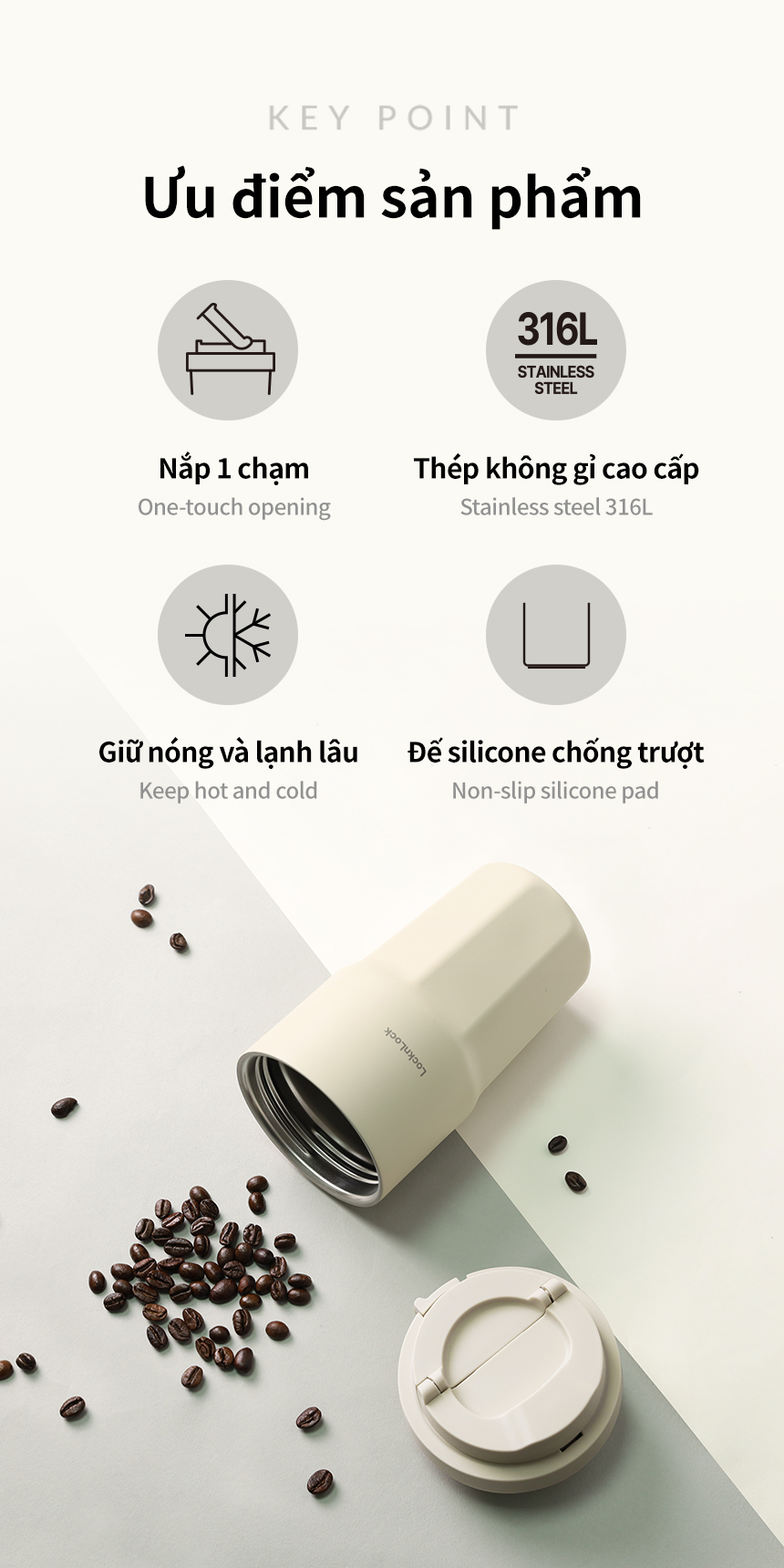 - Nắp 1 chạm: Đóng mở nắp dễ dàng bằng một tay, giúp bạn thưởng thức đồ uống vô cùng tiện lợi