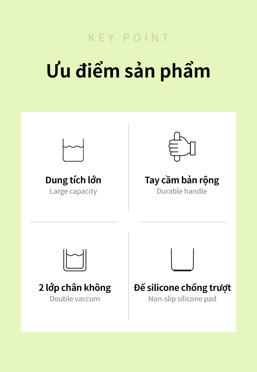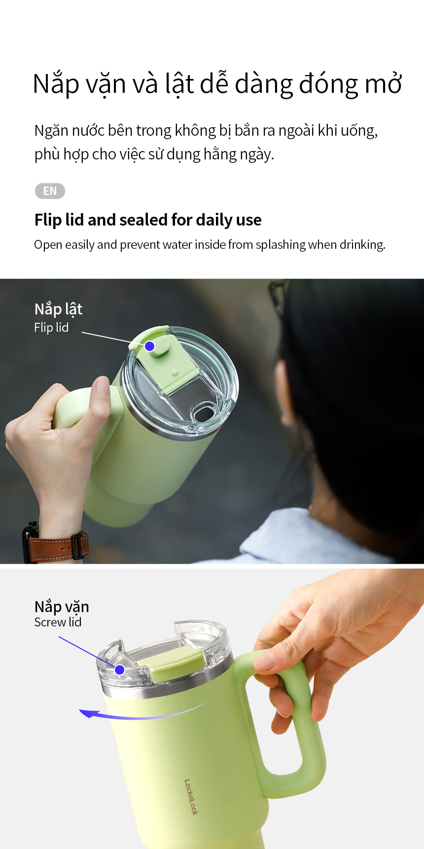 - Nắp vặn cùng với nắp lật tiện lợi cho việc sử dụng hàng ngày, đảm bảo vệ sinh, ngăn bụi cũng như giúp duy trì nhiệt độ nước bên trong.
