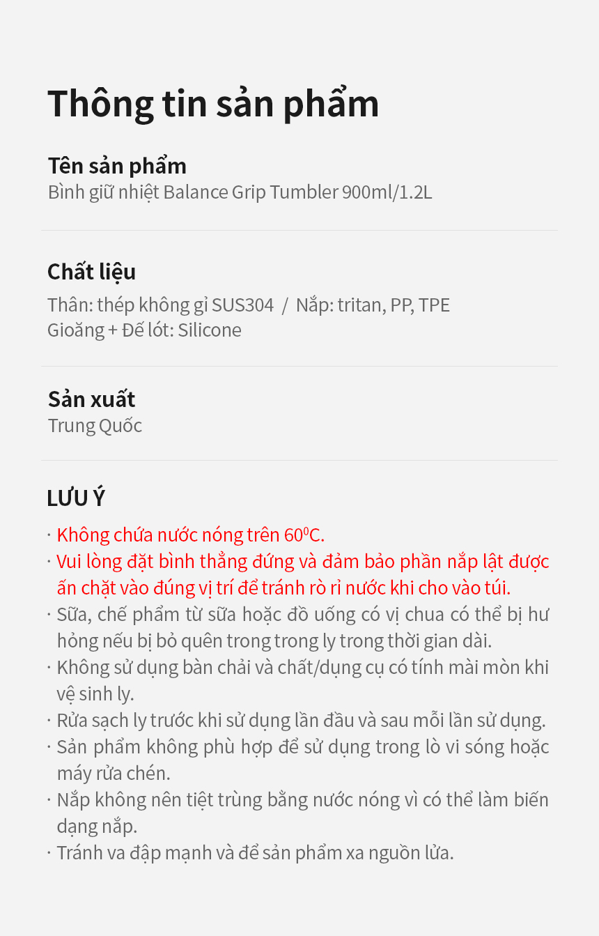 Cấu tạo: Thân: thép không gỉ SUS304; Nắp: Tritan, PP, TPE; Gioăng, bottom pad: silicone