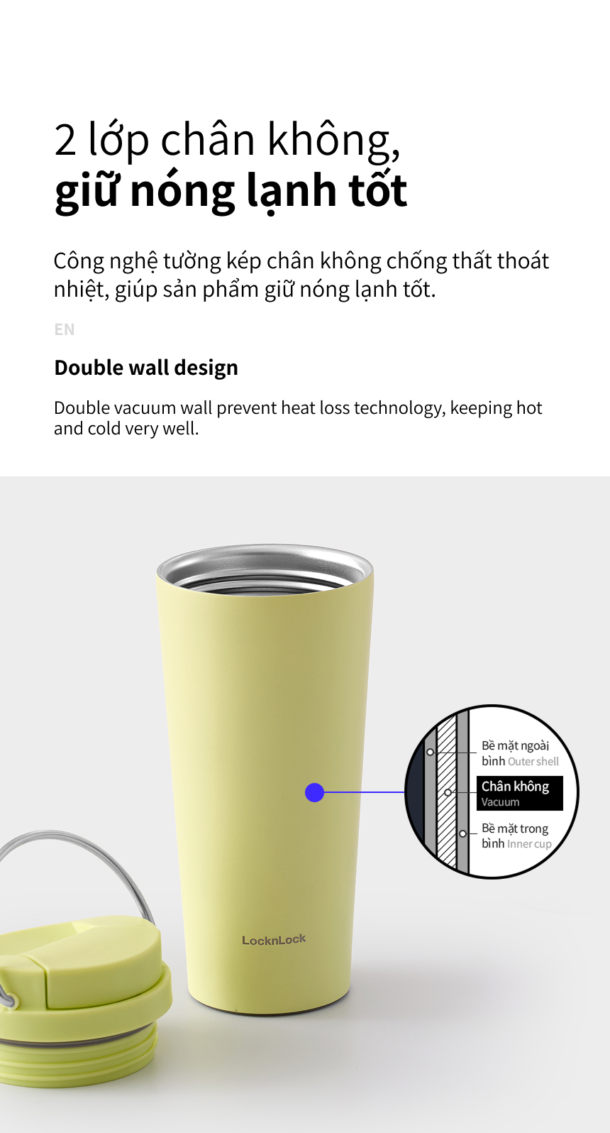 Cấu tạo: Thân cốc: Bên trong: thép không gỉ 304; bên ngoài: thép không gỉ SUS304; Nắp: nhựa PP; Gioăng & miếng lót đế: Silicone