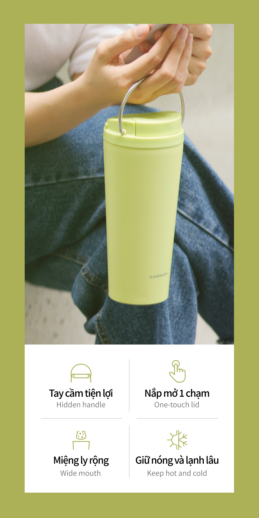 Ly Giữ Nhiệt LocknLock Bucket One Touch LHC3345 550ml, Hàng Chính Hãng, Quai Xách Tiện Lợi - JoyMall