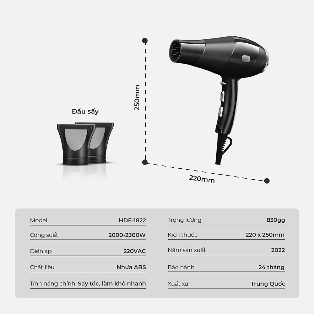 Tốc độ sấy3 chế độ: 2 mức độ sấy nóng, 1 chế độ sấy trung,1 mức độ sấy mát