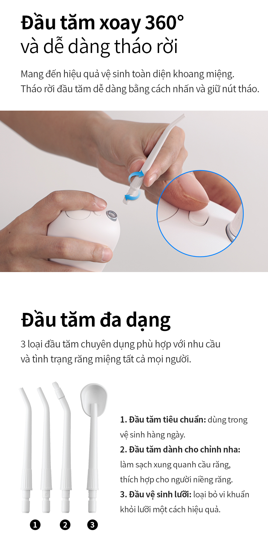 Với 3 loại đầu tăm chuyên dụng, máy phù hợp với tất cả nhu cầu và tình trạng rặng miệng của mỗi người: