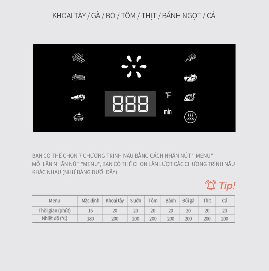 Nấu ăn một chạm dễ dàng điều chỉnh thời gian và nhiệt độ với 7 chế độ cài đặt sẵn: Khoai tây, gà, bò, tôm, thịt, bánh ngọt và cá.