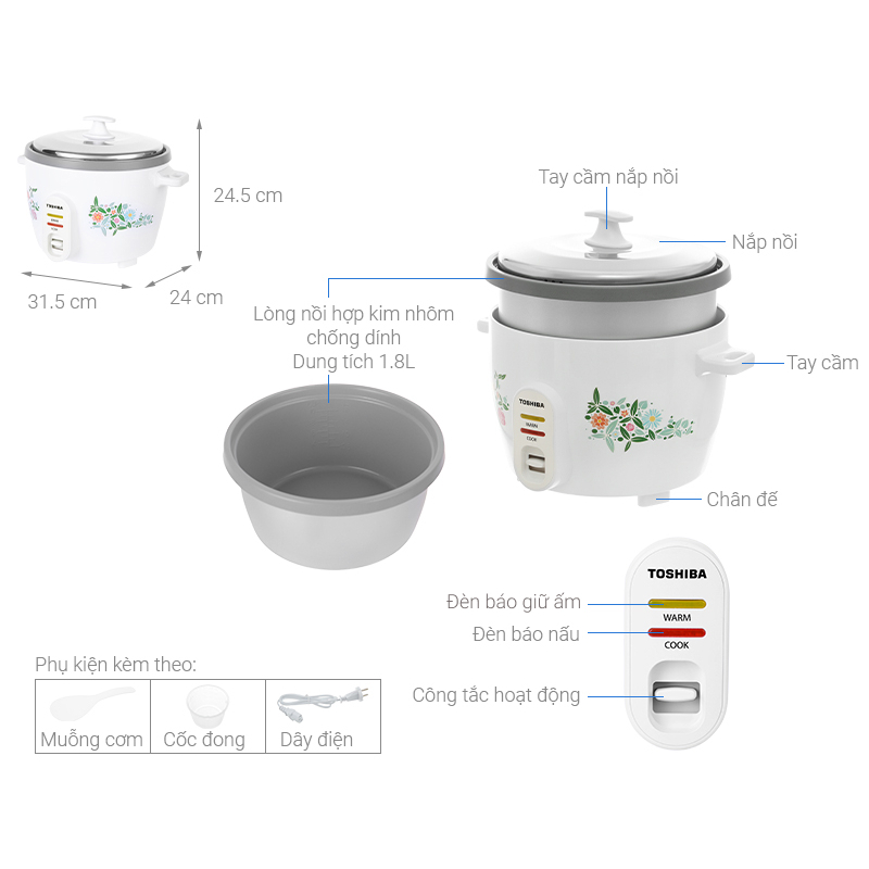 Nồi cơm điện nắp rời Toshiba RC-18MH1PV(F) 1.8L, Hàng chính hãng, Lòng nồi hợp kim nhôm phủ chống dính, 2 chế độ -JoyMall
