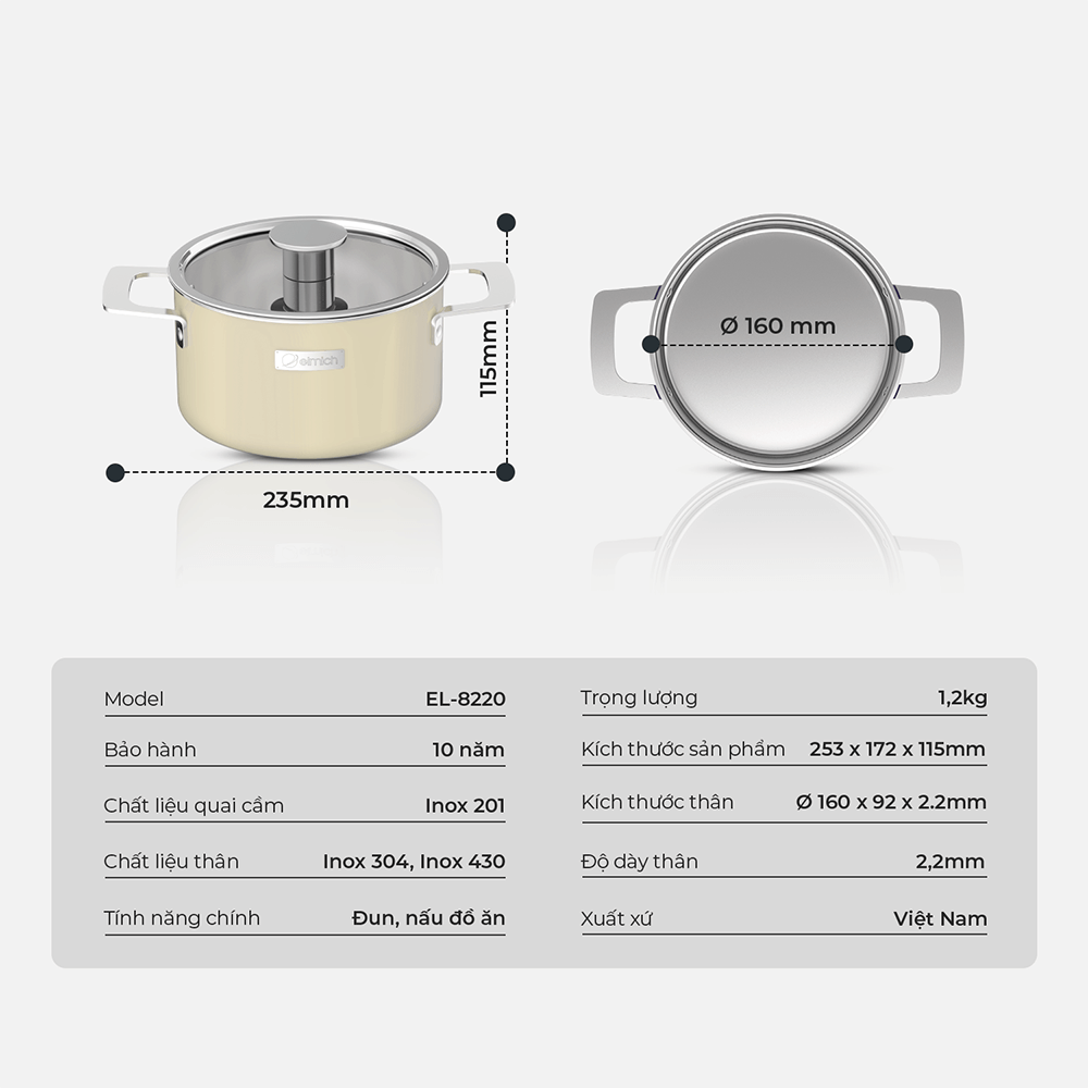 Nồi inox liền khối EL-8220 16cm, EL-8221 18cm, EL-8222 20 cm, EL-8223 22cm, EL-8224 26cm, hàng chính hãng - JoyMall