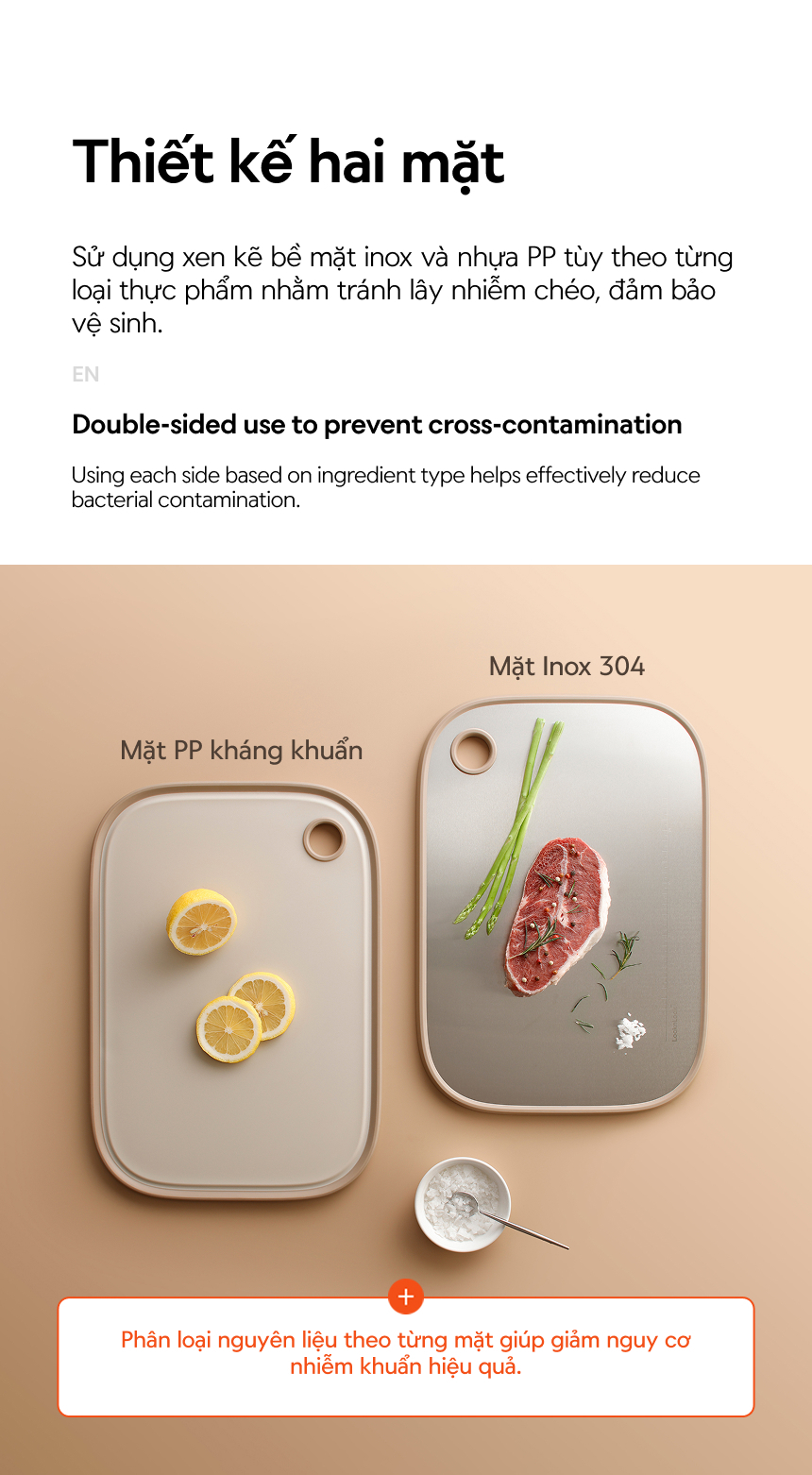 - THIẾT KẾ HAI MẶT: Sử dụng xen kẽ bề mặt inox và PP tùy theo từng loại thực phẩm nhằm tránh lây nhiễm chéo, đảm bảo vệ sinh.