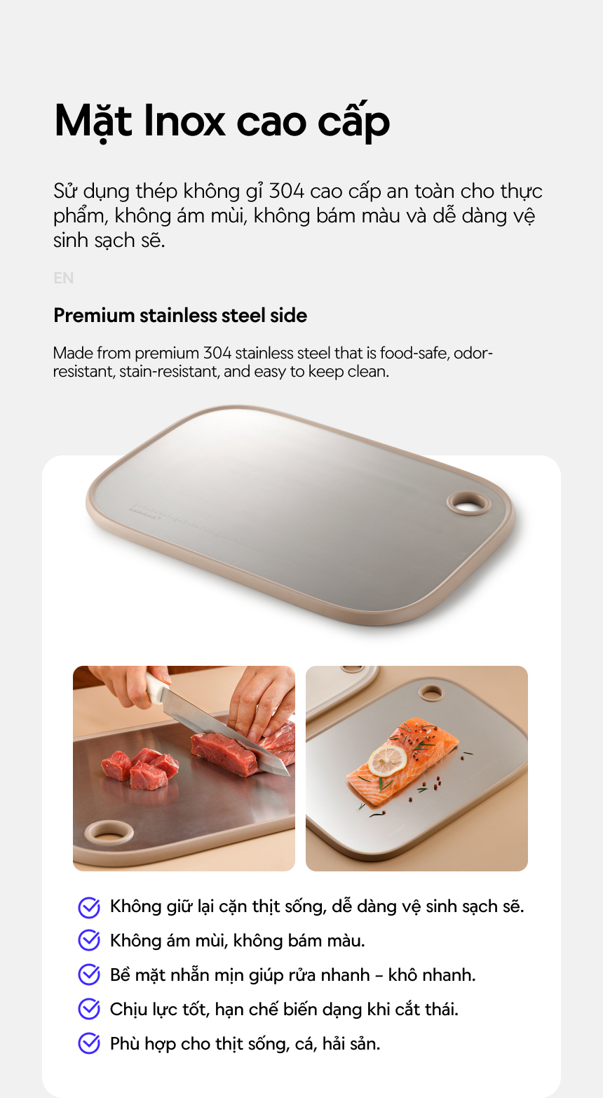 - Mặt thớt bằng thép không gỉ 304 khuyến cáo sử dụng cho thực phẩm tươi sống như thịt, cá, hải sản,... Mặt thớt bằng nhựa khuyến cáo sử dụng cho thực phẩm đã qua chế biến, rau củ quả để tránh lây nhiễm chéo giữa thực phẩm sống và chín.