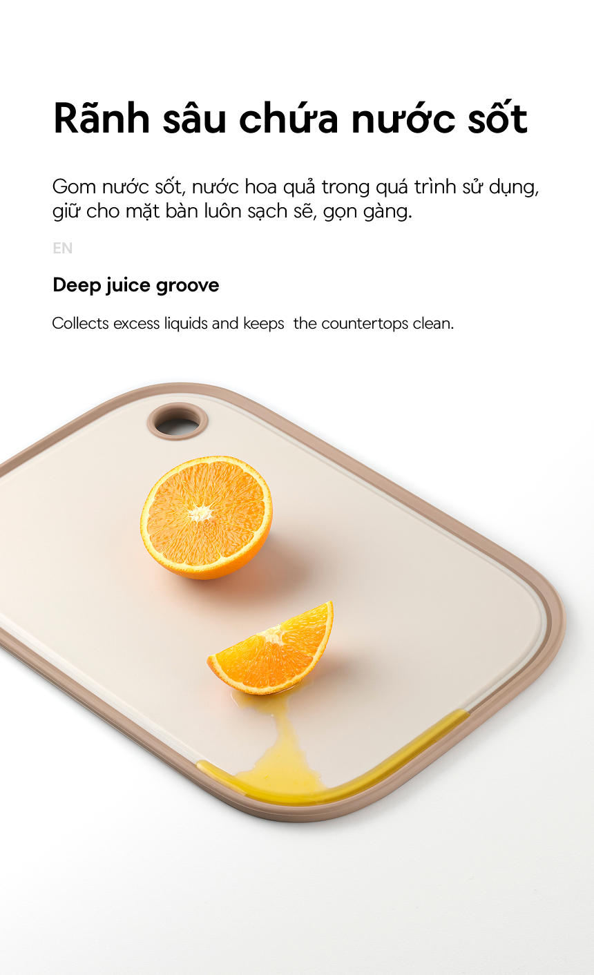 - RÃNH SÂU CHỨA NƯỚC SỐT: Gom nước sốt, nước hoa quả trong quá trình sử dụng, giữ cho mặt bàn luôn sạch sẽ, gọn gàng.
