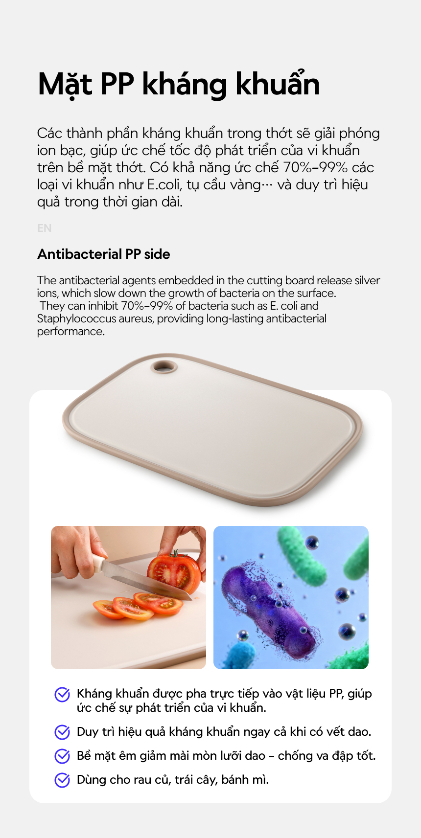 - MẶT PP KHÁNG KHUẨN: Ngăn chặn sự sinh sôi của vi khuẩn gây hại lên đến đến 99.99%.